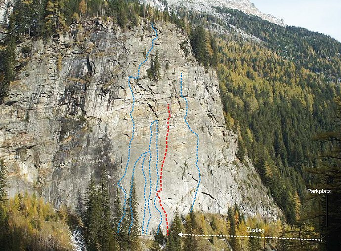 Die Lackenkopfwand ist das Mehrseillängen-Plaisirgebiet schlechthin im Maltatal. Minimaler Zustieg, perfekter Fels, sehr gute Absicherung und sonniges Ambiente garantieren unbeschwertes Klettervergnügen ohne Stress und Nervenkitzel – und das auch schon im Apirl und noch im November.