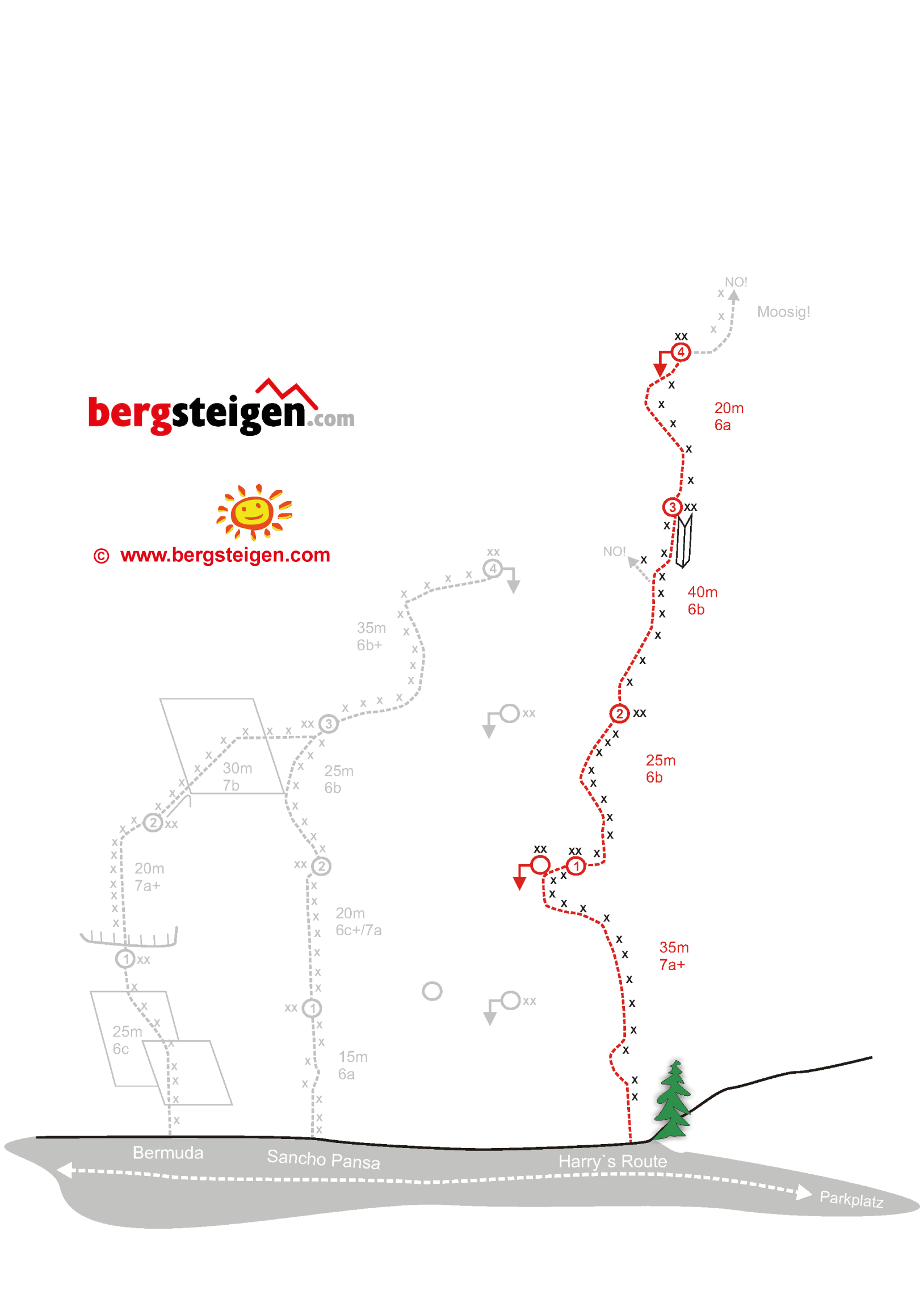 Die hier vorgestellte Route war die erste der Mehrseillängen-Sportklettereien an der Langen Wand. Die Route hat den Namen in Erinnerung an Hari Berger, der die Route eingerichtet hat. Hat man einmal die garstige Einstiegsplatte hinter sich gebracht bietet die Route fantastische Wand- und Plattenkletterei in bestem Fels. Die erste Länge ist weitaus die schwerste; dafür hat man in den anderen Längen etwas mehr Klettervergnügen zwischen den Bohrhaken (aber immer noch gut abgesichert!!). Die Route trocknet sehr schnell ab.