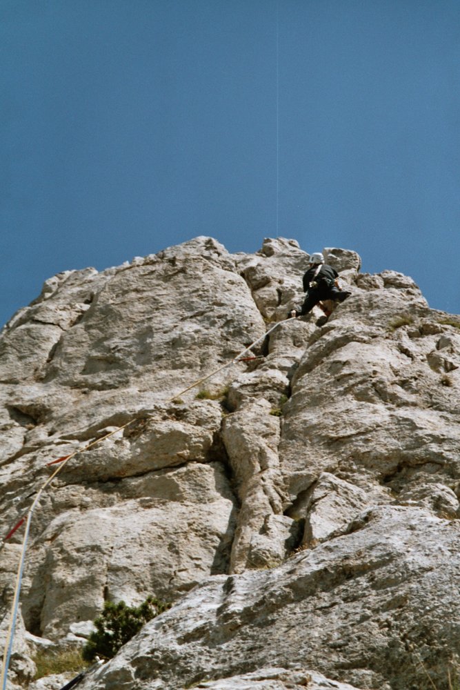 Variante b) Von der Scharte leicht links aufwärts zu Bergrettungshaken. Von dort Abseilmöglichkeit. 2x abseilen zum Windspiel. Rest siehe Topo Windspiel. Wer nicht ganz hinauf will kann in der letzten Seillänge vom Stand Windspiel (Wandbuch) abseilen. ca. 1 Stunde, 2x50m nötig.