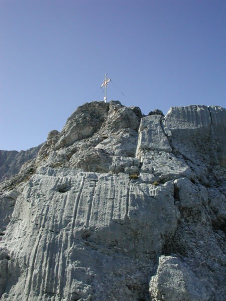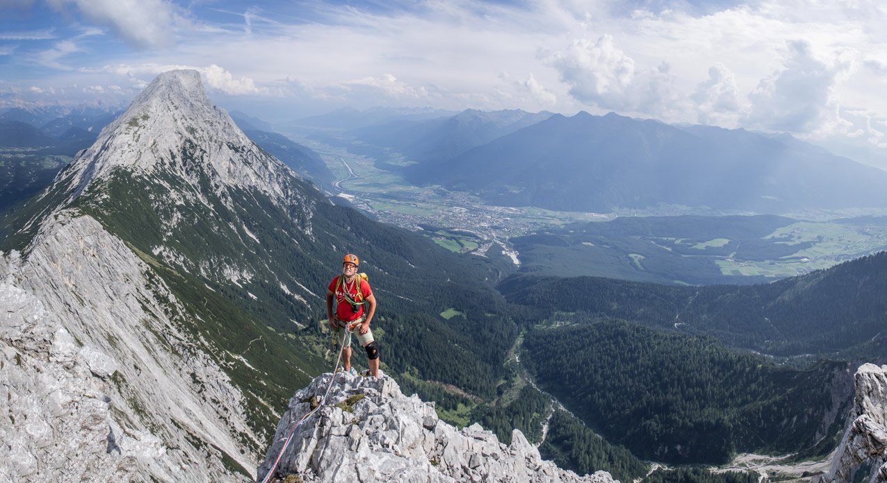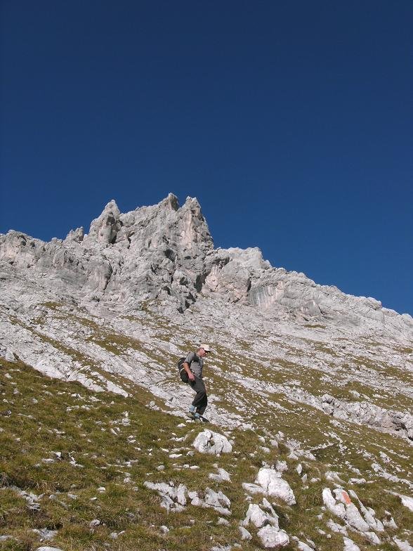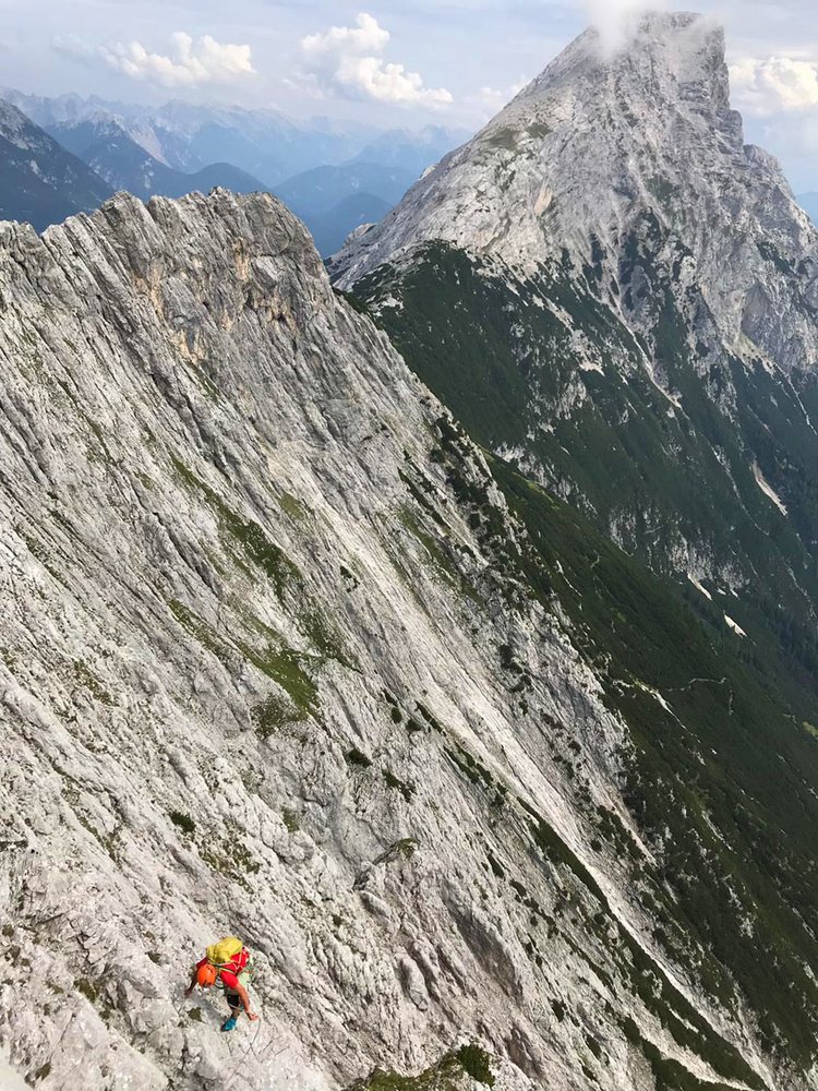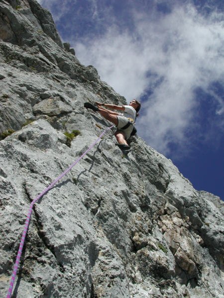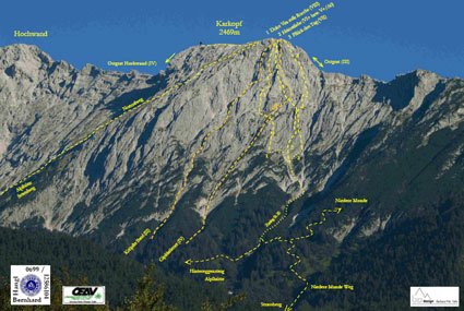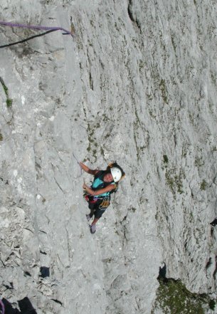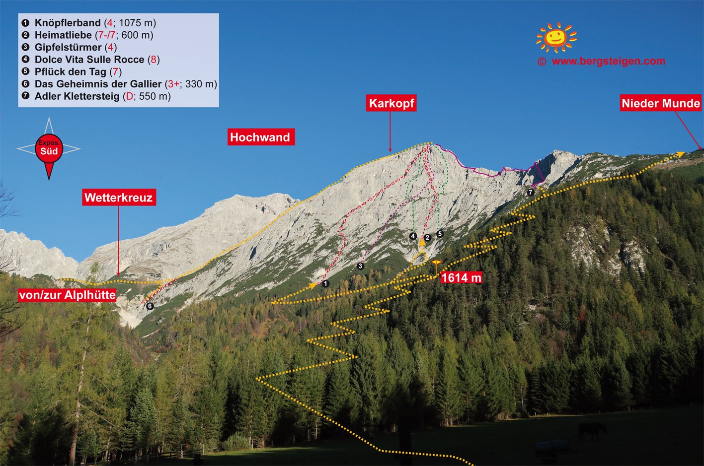 Alpiner Bohrhaken-Klassiker an der Südwand des Karkopfes. Die Route ist gewissermaßen das Sprungbrett zum alpinen Abenteuerklettern, da man zwischen den Bohrhaken auch weite Strecken an nicht ganz festem Fels bewältigen muss. Neben der anspruchsvollen Zustiegsrinne und einigen brüchigen, üblen Wandpassagen gibt es aber auch echte Highlights. Einige tolle Plattenpassagen, steile, griffi ge Wandkletterei und vor allem der gewaltige, landschaftliche Gesamteindruck zeichnen diesen langen Anstieg aus.