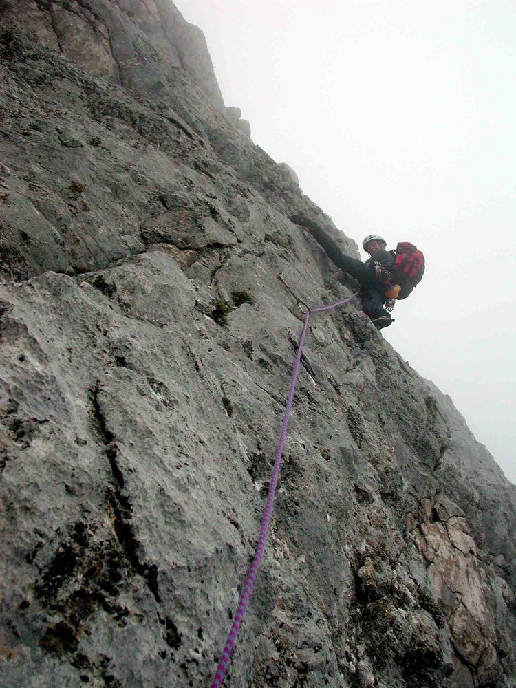 Die lange Zustiegsrinne ist bei Nässe heikel. Auch im Abstieg - sollte man an der Route umkehren müssen - ist der Zustieg anspruchsvoll. Der Vorsteiger sollte ein sehr solides 6/6+ Niveau haben, damit die Seilschaft am Ende auch wirklich den Ausstieg erreicht. Für alpin unerfahrene Kletterer ist dieses Tour definitiv nicht zu empfehlen - in den leichten Passagen nur spärlich mit Bohrhaken abgesichert!