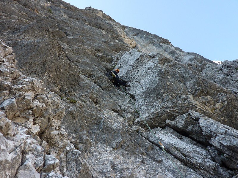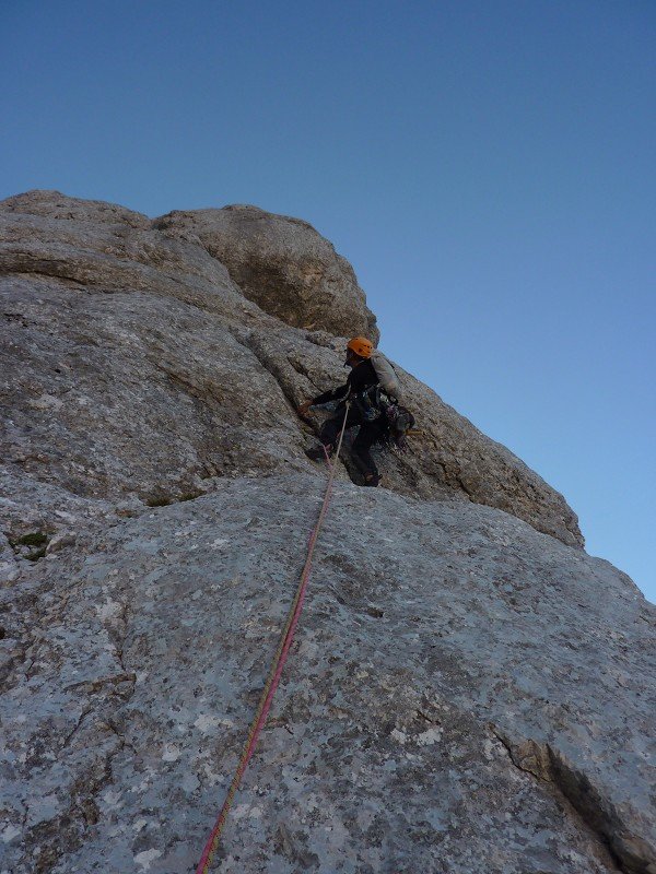 Die Schwierigkeiten liegen dabei auf den ersten 350m. Danach wird die Route viel leichter, wobei einige seilfreie Kletterei im 2.-3. Grad nötig ist. Die Route ist typisch klassisch eingerichtet: Viele Haken in den schweren, wenig in den leichten Längen.