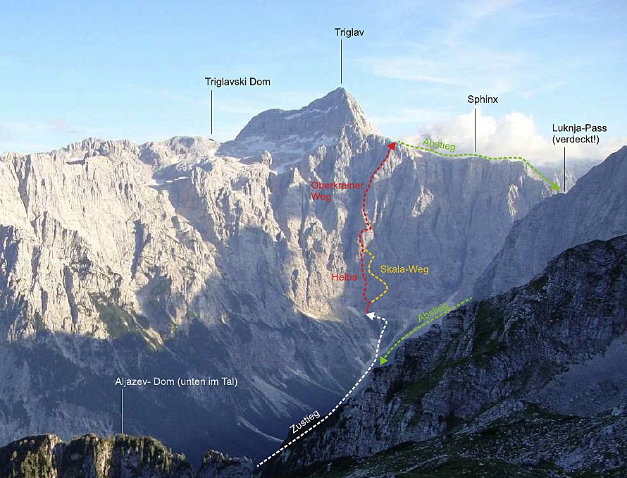 Vom Ausstieg quert man 5-10min auf etwa gleicher Höhe das recht flache Karrenfeld (früher im Jahr Schnee) direkt von der Wand weg (nicht zuviel Höhe verlieren!). So gelangt man auf den markierten Weg, der den Luknja- Pass mit dem Triglav Gipfel verbindet. Über den Weg (Bamberger Weg), der teils mit Drahtseil versichert ist (B und kurze Stellen II), steigt man zum Luknja- Pass ab. In weiterer Folge steigt man nach Osten ins Vratatal ab. Aus dem Schotterfeld vom Pass zweigt links ein Steig ab. Diesem folgt bis zur sichtbaren kleinen Hütte links im Wald. Nun weiter auf dem markierten Weg abwärts zurück zum Aufstiegsweg und zum Auto.