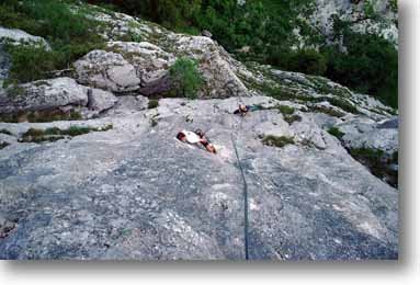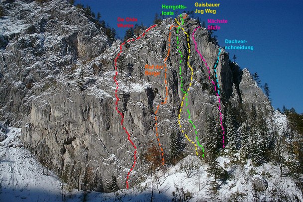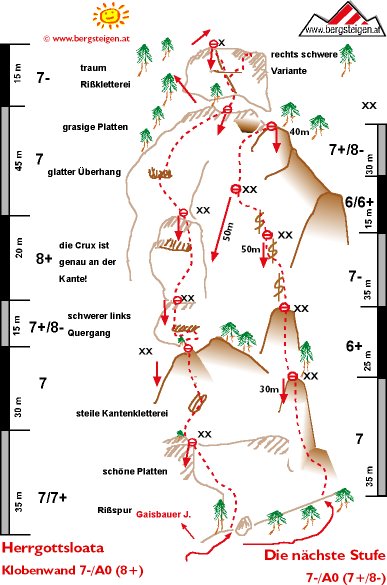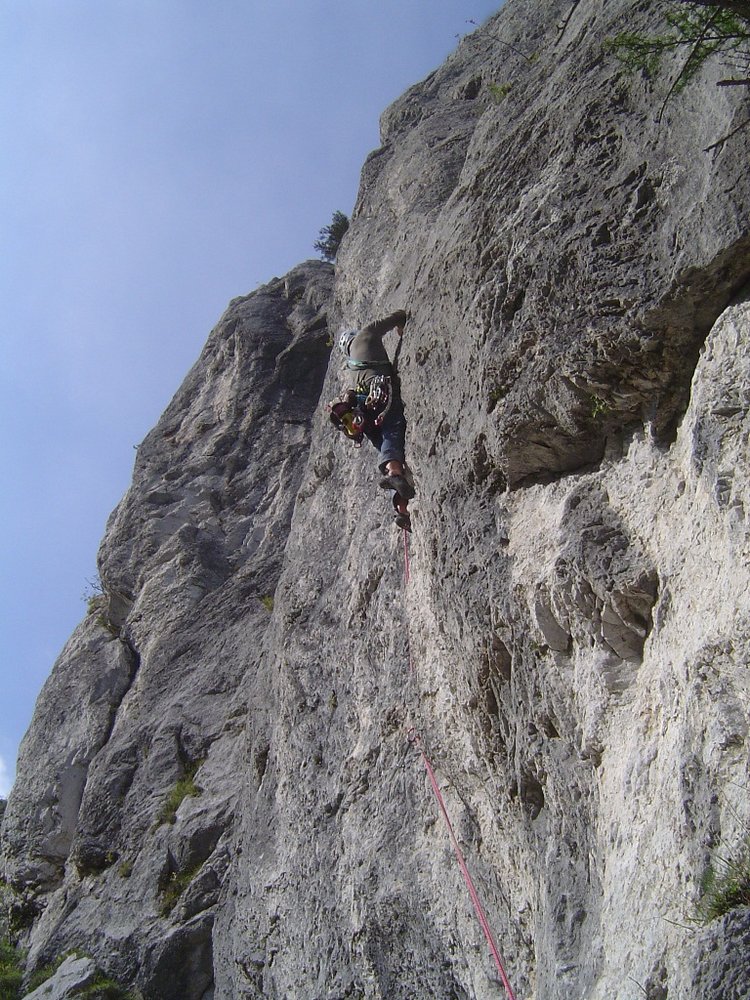 Es ist eine der schönsten Raxrouten in dieser Schwierigkeit. "Steig die Leiter empor, die Natur gab die Linie vor. Drum steig die Leiter empor (wie oft denn noch?). Dein ICH findet ein Platzerl voll Glück, sowie traumhafte Landschaft vor" (Landschaftlich sehr schön, ... aber das sind alle Touren im großen Höllental! Oder ist damit die grasige 5te Seillänge gemeint?). Trotzdem, diese Tour ist wirklich gut, ein Lob an die Erstbegeher!