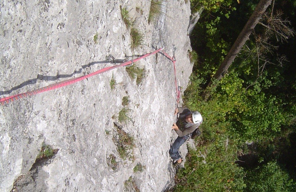 Einfachseil (50 m Doppelseil, wenn Abgeseilt wird), 11 Expreßschlingen, Helm und eine lange Bandschlinge.