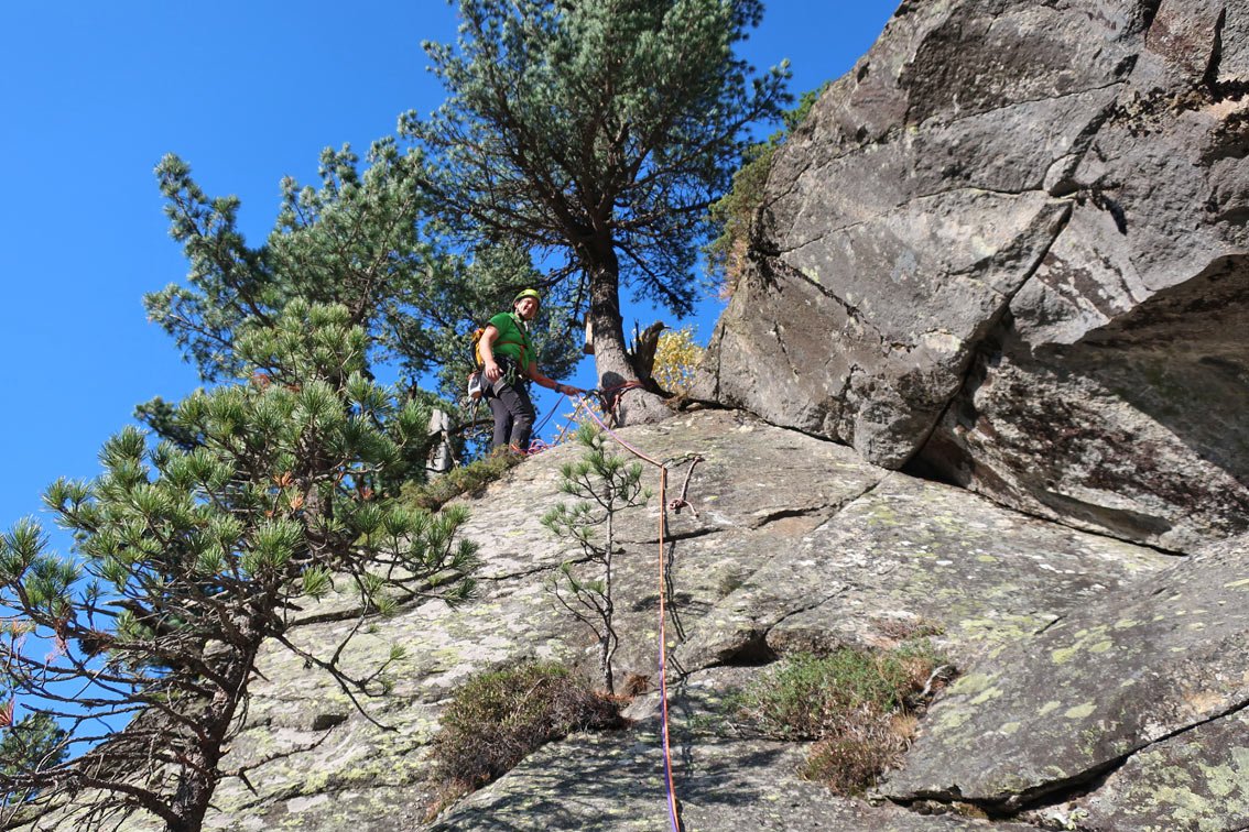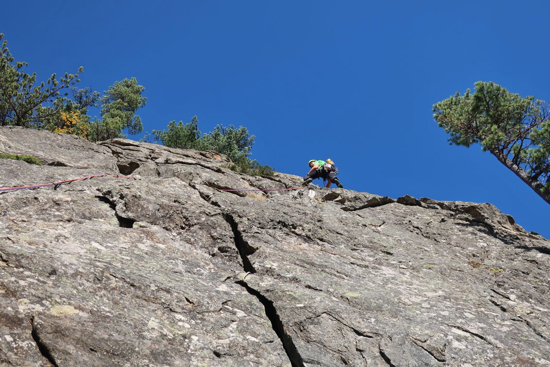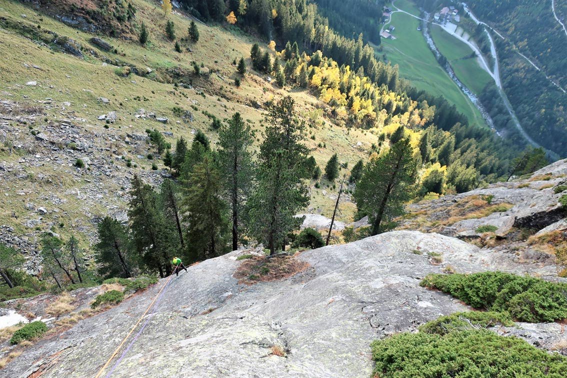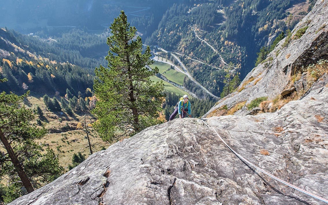 Sehr gute und wunderschöne Route, die perfekt mit Bohrhaken abgesichert ist. Die Kletterei wechselt zwischen griffi gen Platten, steilen, mit Quarzsteinchen bespickten Wandstellen und tollen Rissschuppen, glatte Passagen gibt es nur wenig. „Herzblut“ gehört zu den besten leichteren Mehrseillängenrouten im Zillertal - der Besuch lohnt sich absolut!