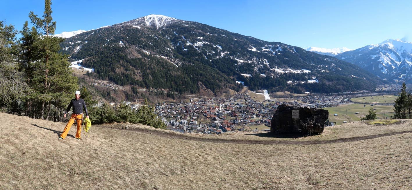 Vom Ausstieg nach rechts zum Wanderweg (E5) und auf diesem hinunter zum Schotterweg auf der Autobahngalerie. Von dort wie beim Zustieg zurück zum Auto.