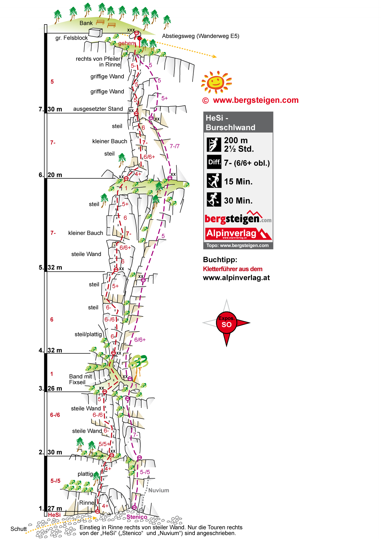 Die HeSi verläuft durch den zentralen Wandteil der Burschlwand und ist eine der leichtesten Touren an der Felswand (nur zwei Seillängen mit jeweils einer 7- Passage). Die Tour wird gegen oben hin immer besser und hat in der vorletzten Seillänge ein ausgesetztes Finale. Die Tour ist aber nicht so fordernd, wie die gleich rechts davon verlaufende "Stenico" - mit einem schwächeren Seilpartner kann man diesen Anstieg ins Auge fassen (es gibt auch keine schweren Querungen). Wie die anderen Touren auch, eignet sich der Anstieg vor allem im Frühjahr und im Herbst - im Sommer ist es zu heiß.