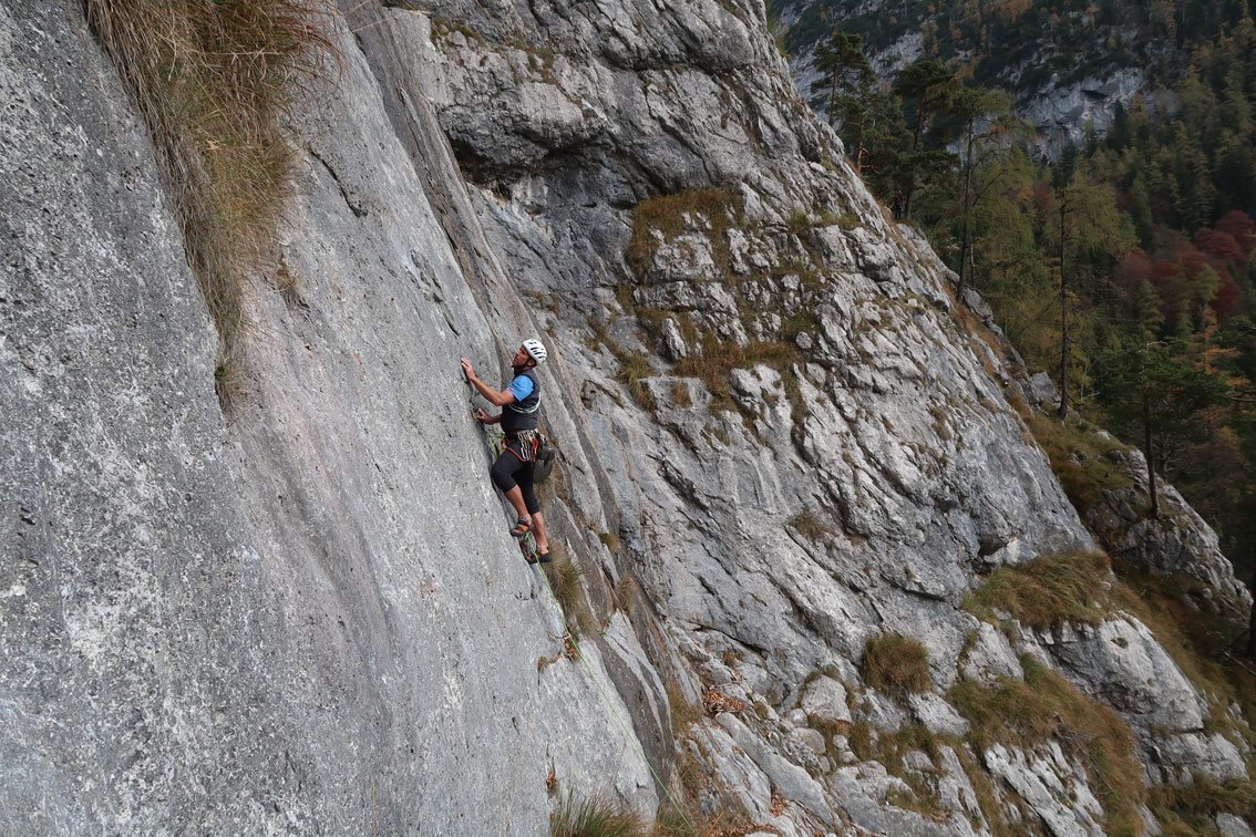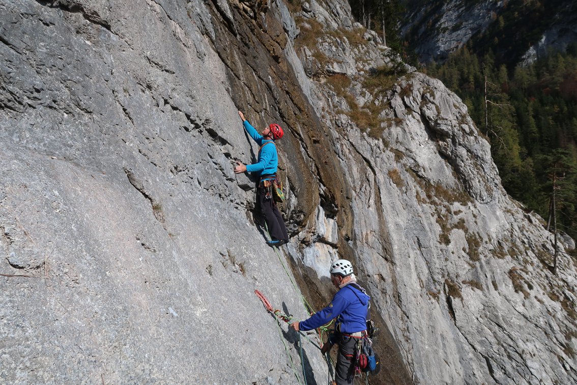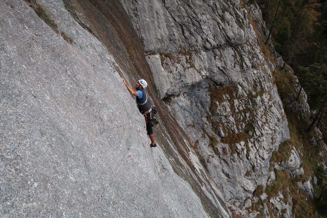 Die rechte der drei zentralen Platten-Plaisirtouren. Die Tour ist rechts nahe an einer Wasserspur - je nach Wassermenge auch Wasserfall - und deshalb vor allem oben oft nass. Wenn sie aber trocken ist, dann ist sie gleich gut wie die "Ethikkommison" oder die "Energiewende" und deshalb auch zu empfehlen. Der Fels ist oft so rau, so dass das wenige Wasser auch nicht so stört.
