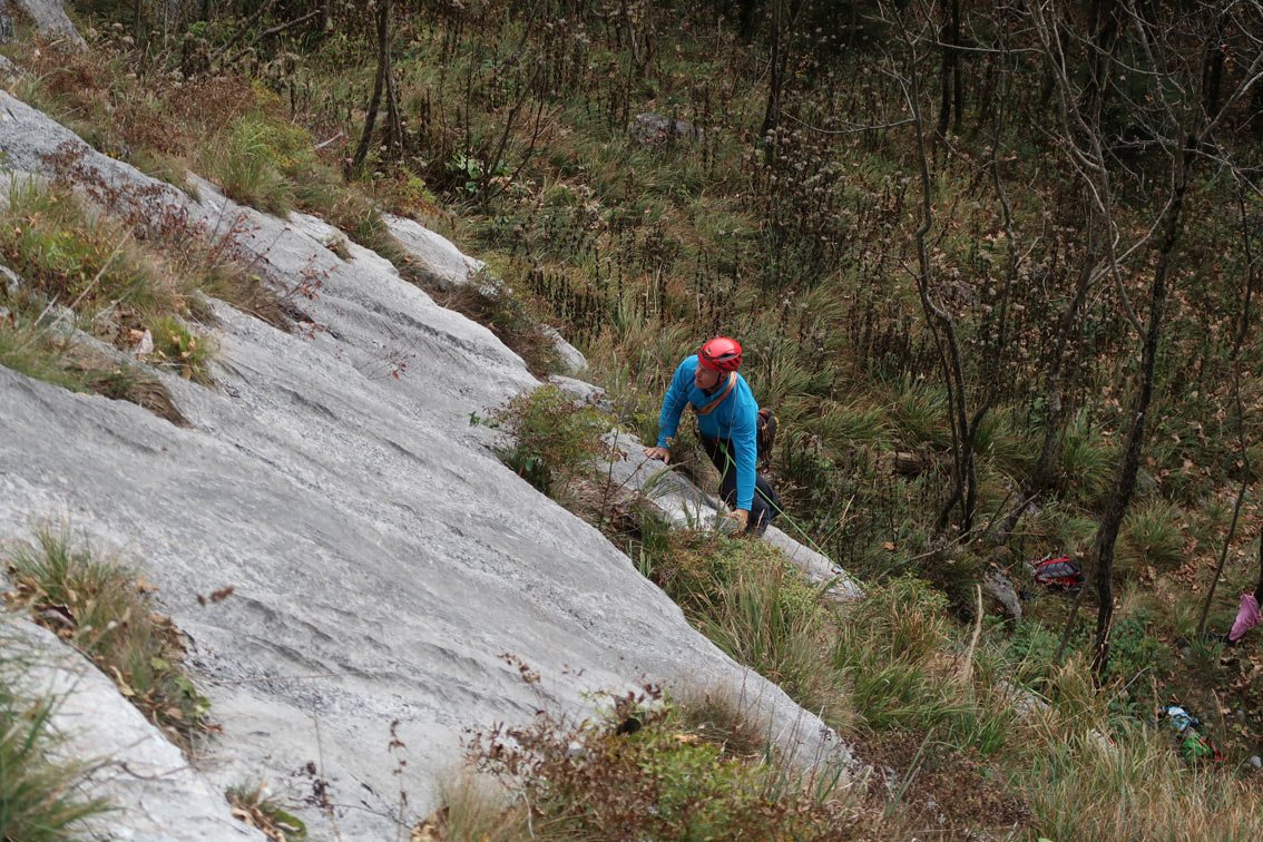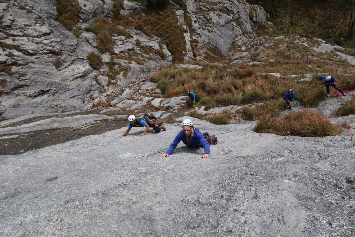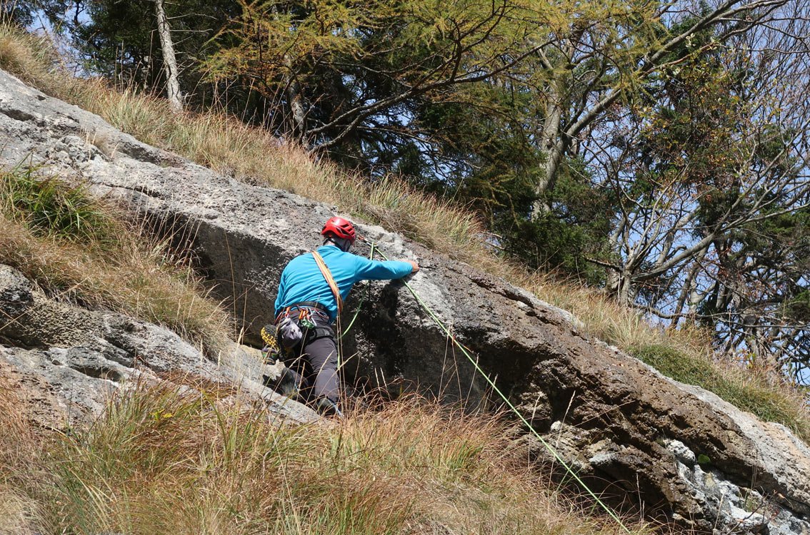 1 x 60 m Einfachseil, 11 Expressschlingen und Helm.