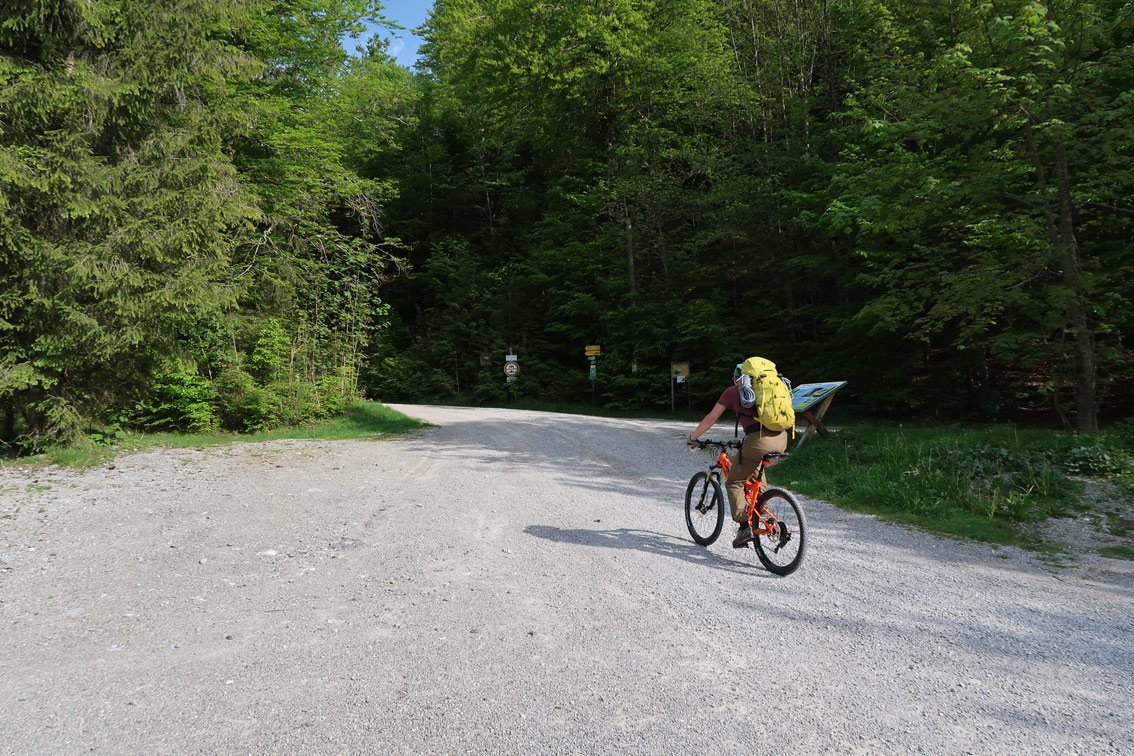 Bei Nässe sind die Platten mit den Graseinlagen nicht ideal zu klettern - vor allem die Kaminverschneidung ist oft nass (nach größeren Regenfällen besser ein bis zwei trockene Tage abwarten). Als Abstieg ist der Fußabstieg sicher besser (weniger Steinschlag und das Seil bleibt nicht im Gestrüpp hängen), dafür klettert man noch zwei Seillängen der Route "Fahrt ins Blaue" hinauf bis zum Gipfel. Für den Zu- und Abstieg ist ein Mountainbike hilfreich.