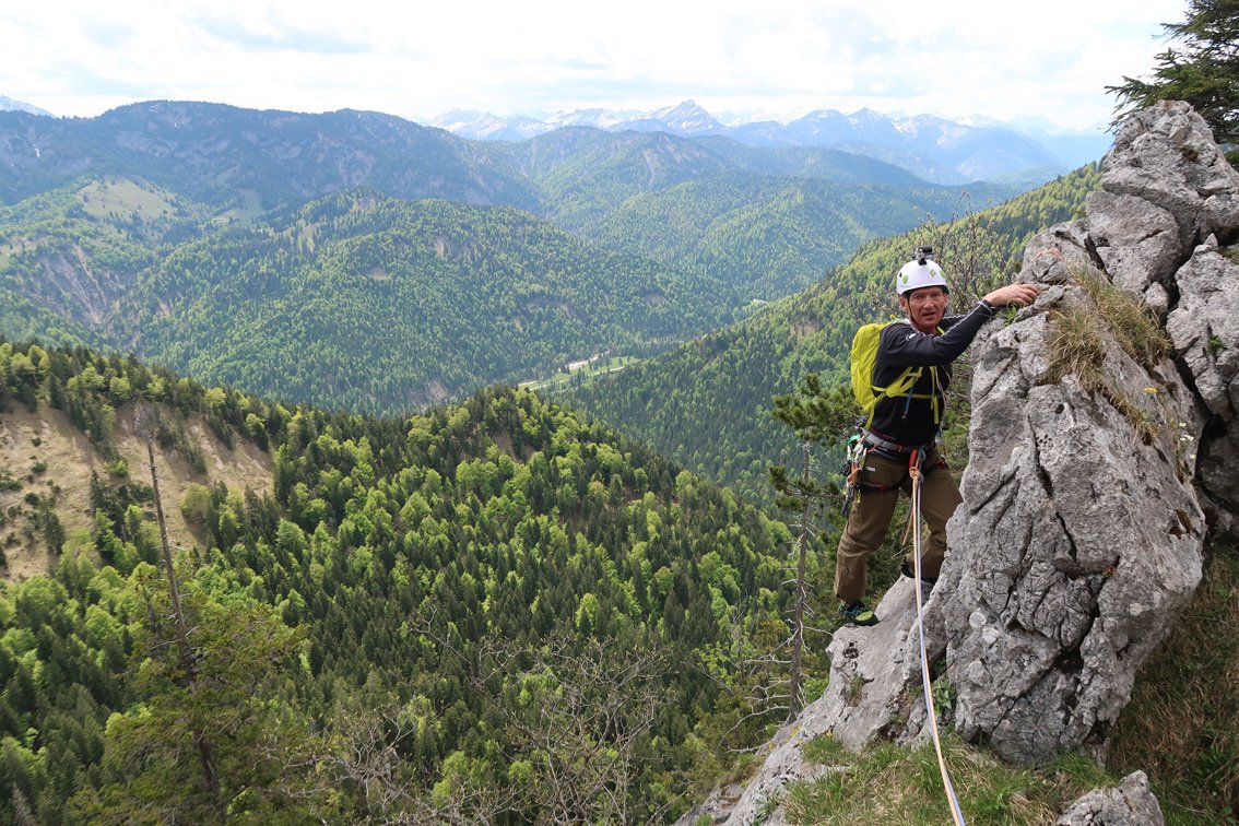 Abseilen über die rechts liegende Route "Aprilscherz". Den Abseilstand erreicht man vom letzten Stand in einer kurzen, waagrechten Querung nach rechs (ca. 15 m auf einem Grasband). Wer die zwei Seillängen von "Fahrt ins Blaue" zum Gipfel klettert (siehe Topo), steigt an der Nordseite auf dem markierten Weg hinunter zum Forstweg (einmal im unteren Teil nach links, nicht in Richtung Kreuth nach rechts). Auf dem Forstweg zurück zum Parkplatz.