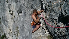 Eine großartige Linie durch die Blechmauer rechts von der Blechmauernverschneidung, die aufgrund ihrer üppigen Absicherung auch dem A0-Kletterer eine Chance lässt. Mit DAV-Ringhaken an den Ständen gesichert, dazwischen seit 204 gute Bolts und SUs. Extreme Ausgesetztheit und sehr fotogene Stellen in einer abwechslungsreichen Kletterei. Bemerkungen: Standplatz nach der 2.SL an 3 Sanduhren - kann sehr gut mit Bandschlingen nachgebessert werden. Am Beginn der Platte in der dritten SL steckt jetzt (August 2000) ein solider Bohrhaken. Es empfiehlt sich NICHT unmittelbar nach der Platte einen Stand zu machen, sondern den Riss aufwärts in den Rechtsquergang bis nach der dreieckigen Schuppe zu klettern (NICHT links von der Schuppe aufwärts!) - der 3. Stand ist ca. 3m rechts der Schuppe (Ringhaken) und erst spät zu sehen.