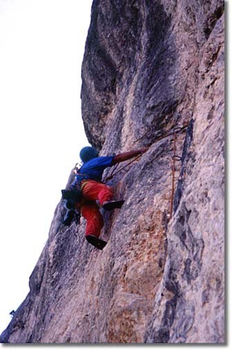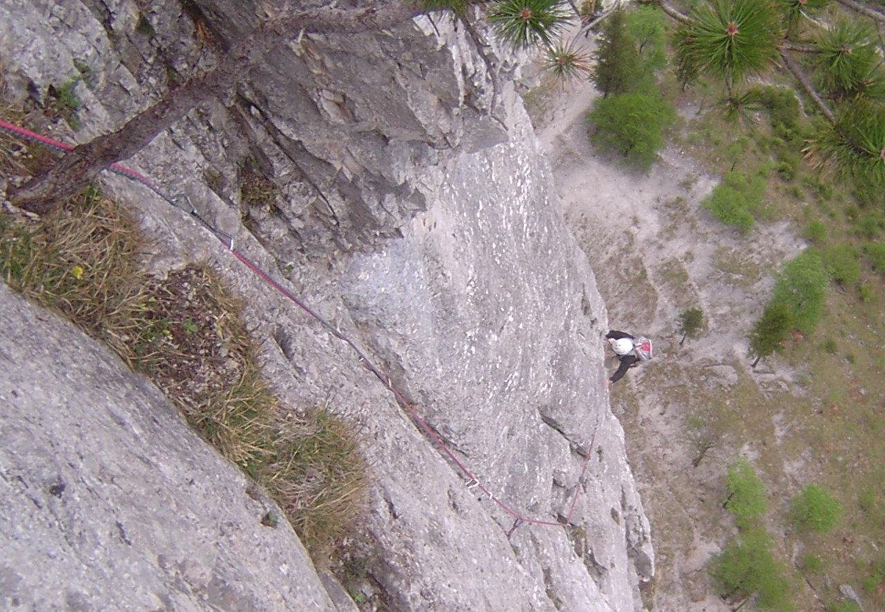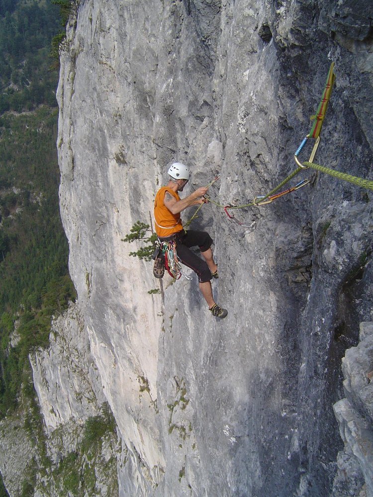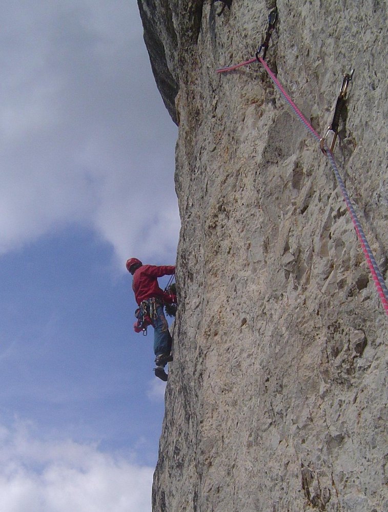 Eine großartige Linie durch die Blechmauer rechts von der Blechmauernverschneidung, die aufgrund ihrer üppigen Absicherung auch dem A0-Kletterer eine Chance lässt. Mit DAV-Ringhaken an den Ständen gesichert, dazwischen seit 204 gute Bolts und SUs. Extreme Ausgesetztheit und sehr fotogene Stellen in einer abwechslungsreichen Kletterei. Bemerkungen: Standplatz nach der 2.SL an 3 Sanduhren - kann sehr gut mit Bandschlingen nachgebessert werden. Am Beginn der Platte in der dritten SL steckt jetzt (August 2000) ein solider Bohrhaken. Es empfiehlt sich NICHT unmittelbar nach der Platte einen Stand zu machen, sondern den Riss aufwärts in den Rechtsquergang bis nach der dreieckigen Schuppe zu klettern (NICHT links von der Schuppe aufwärts!) - der 3. Stand ist ca. 3m rechts der Schuppe (Ringhaken) und erst spät zu sehen.