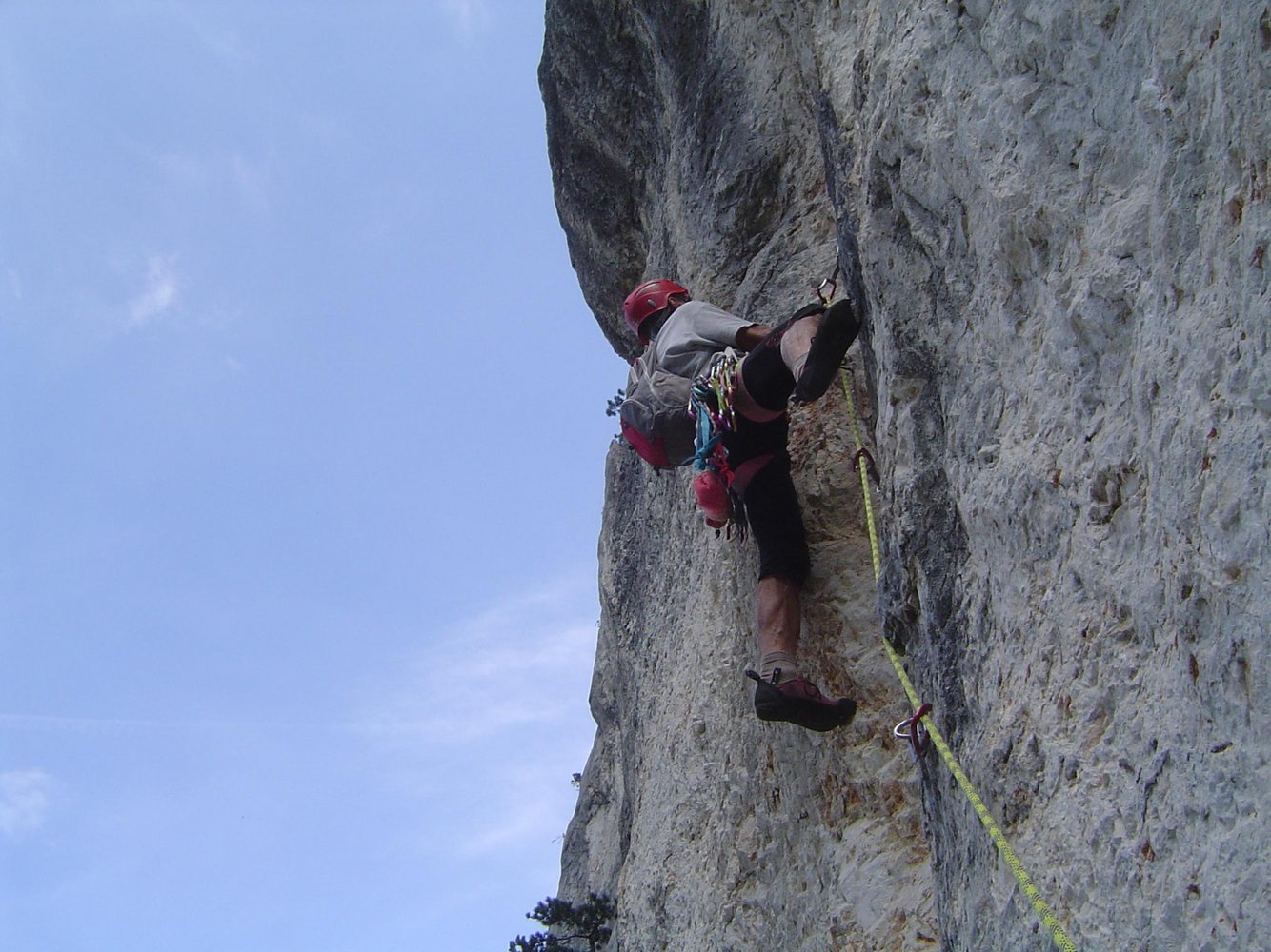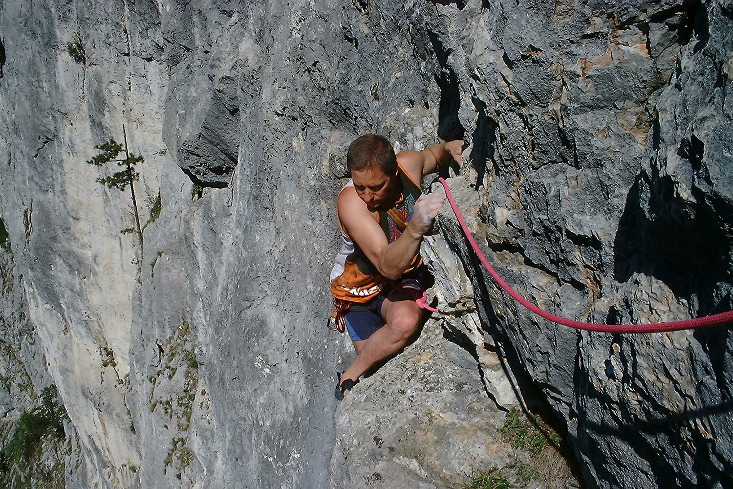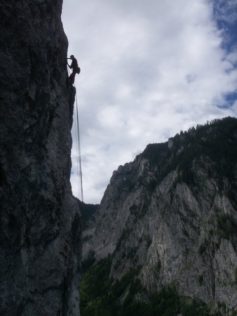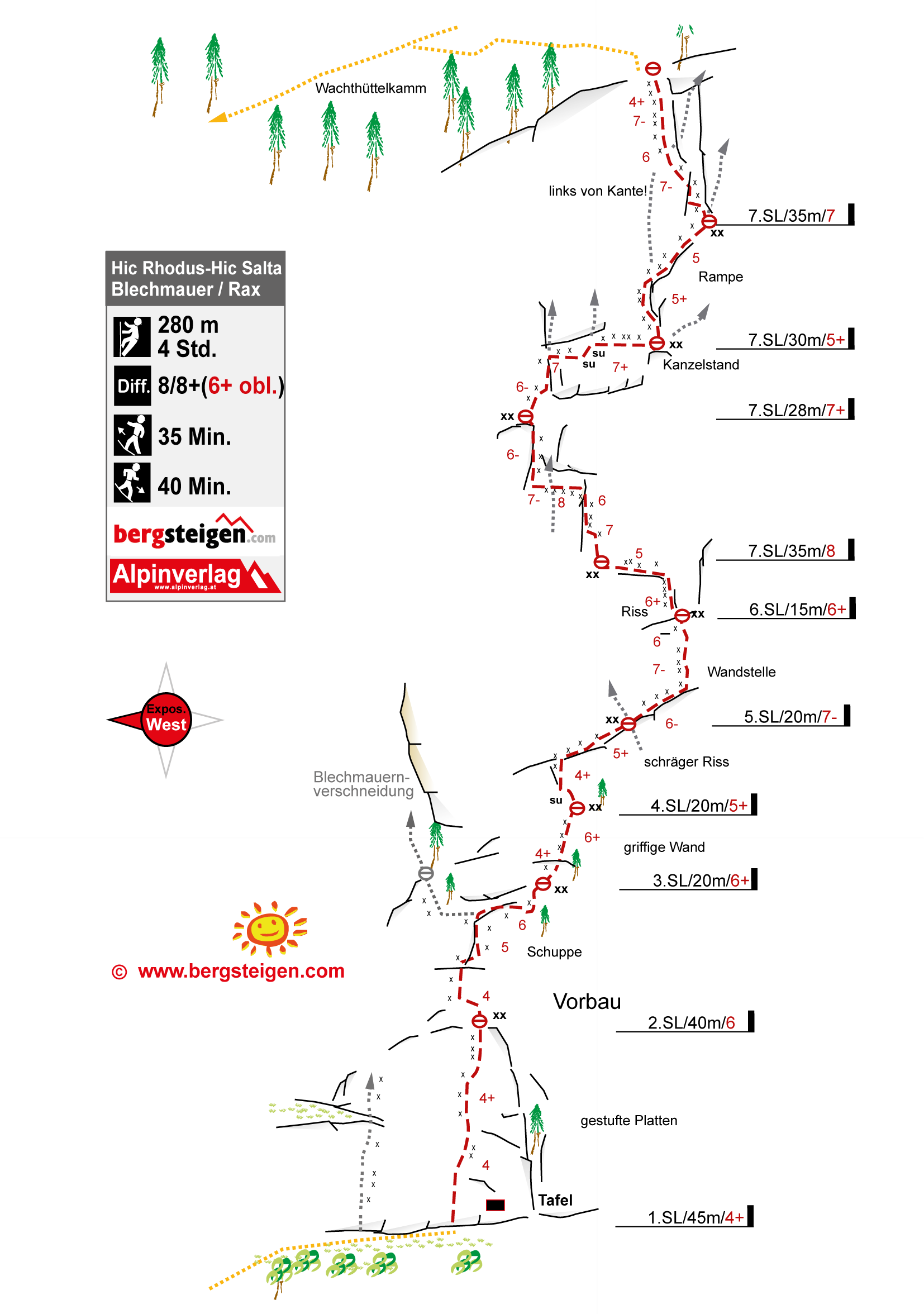 Eine großartige Linie durch die Blechmauer rechts von der Blechmauernverschneidung, die aufgrund ihrer üppigen Absicherung auch dem A0-Kletterer eine Chance lässt. Mit DAV-Ringhaken an den Ständen gesichert, dazwischen seit 204 gute Bolts und SUs. Extreme Ausgesetztheit und sehr fotogene Stellen in einer abwechslungsreichen Kletterei. Bemerkungen: Standplatz nach der 2.SL an 3 Sanduhren - kann sehr gut mit Bandschlingen nachgebessert werden. Am Beginn der Platte in der dritten SL steckt jetzt (August 2000) ein solider Bohrhaken. Es empfiehlt sich NICHT unmittelbar nach der Platte einen Stand zu machen, sondern den Riss aufwärts in den Rechtsquergang bis nach der dreieckigen Schuppe zu klettern (NICHT links von der Schuppe aufwärts!) - der 3. Stand ist ca. 3m rechts der Schuppe (Ringhaken) und erst spät zu sehen.