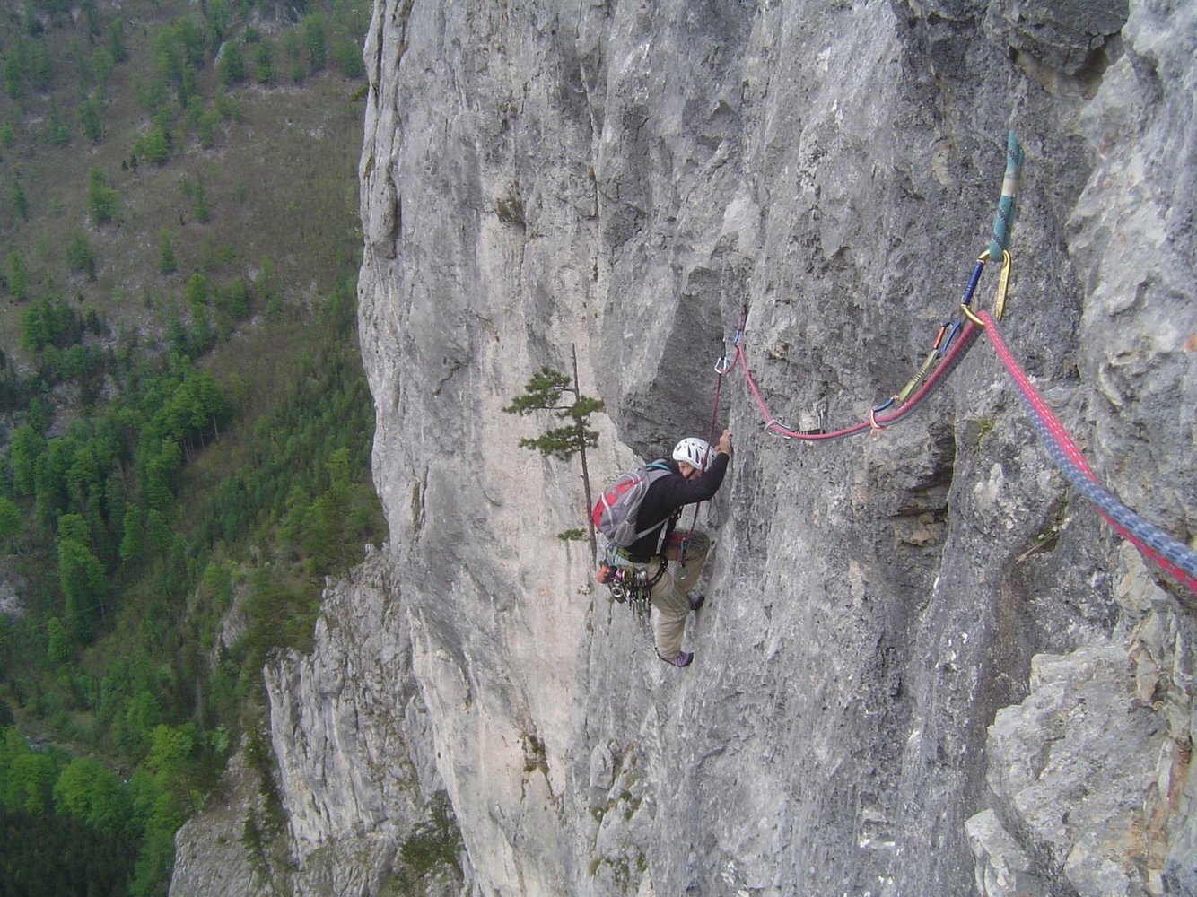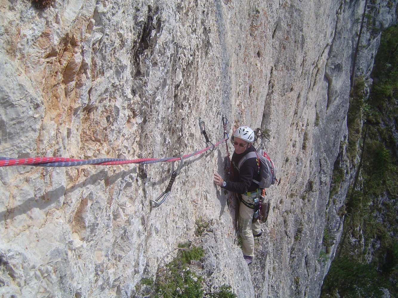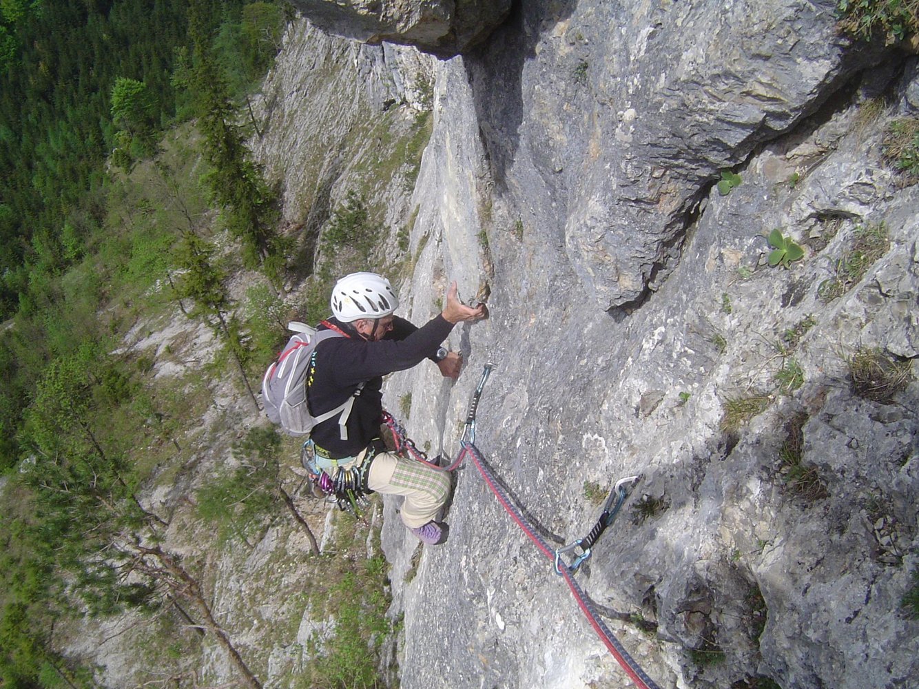 50 m Einfachseil, 18 (!) Expressschlingen für die A0-Variante (wenn man alles einhängt) - ansonst 12, 3 kurze Bandschlingen (+ 1 lange Bandschlinge bei A0-Begehung), Helm