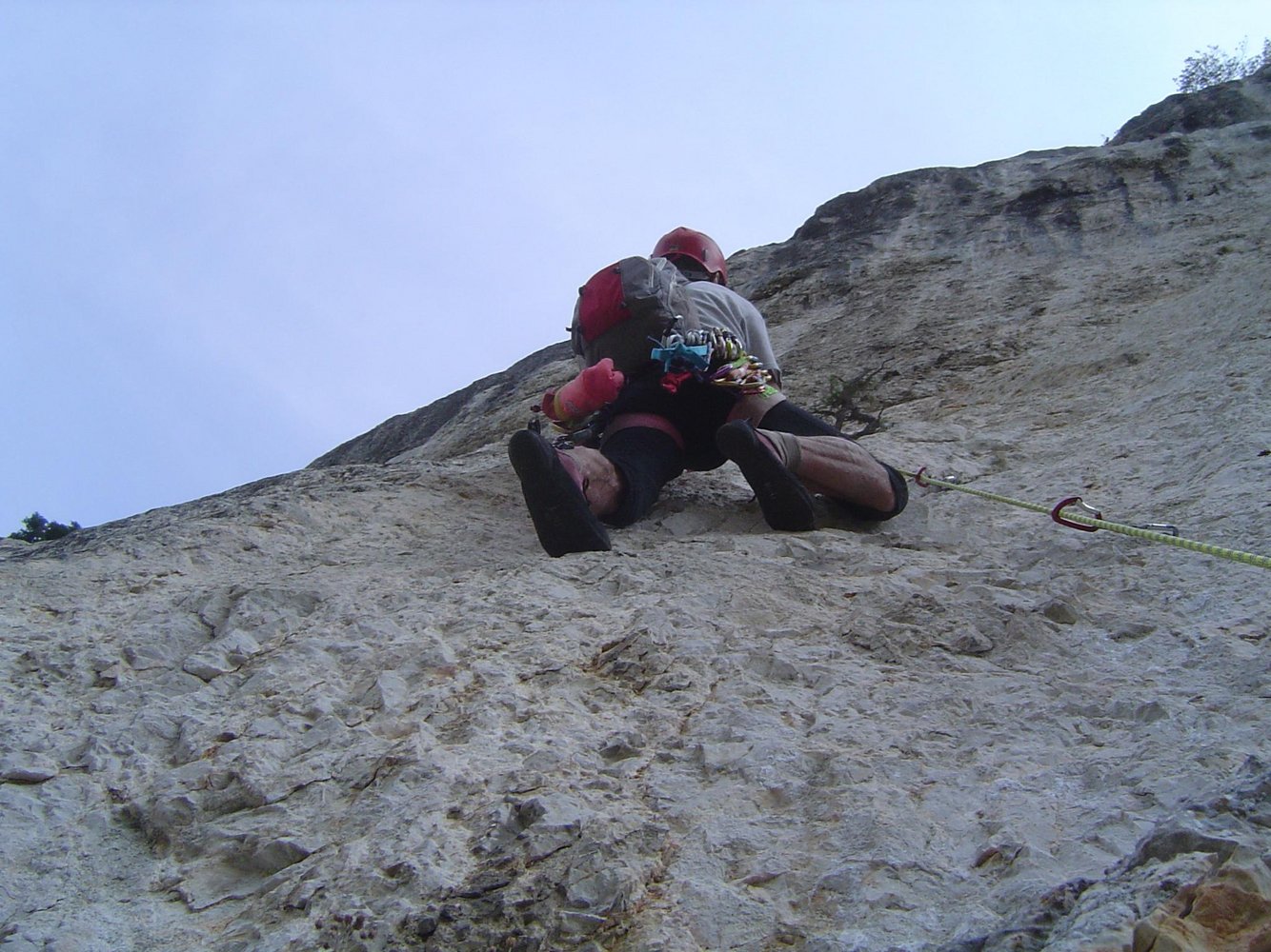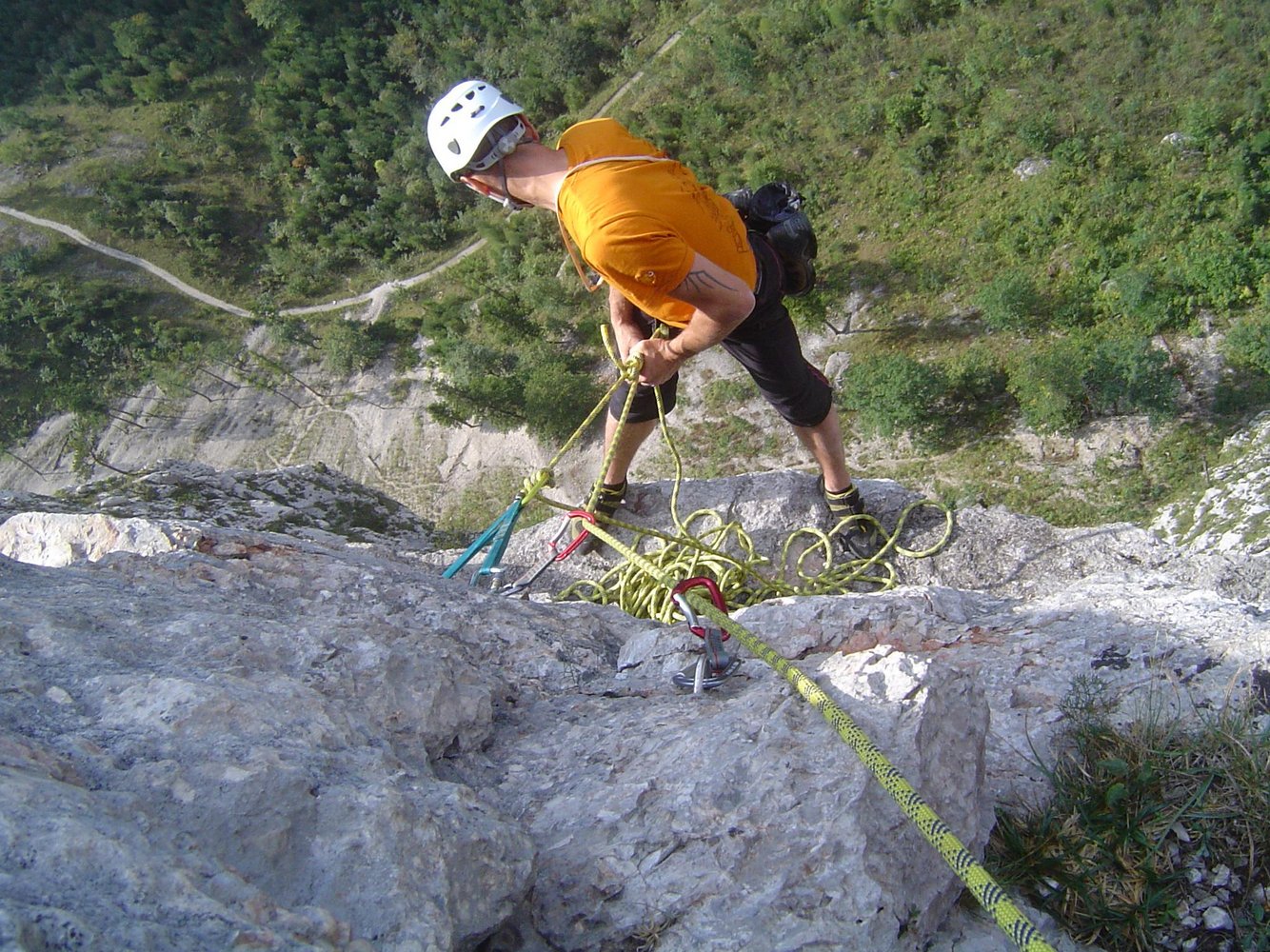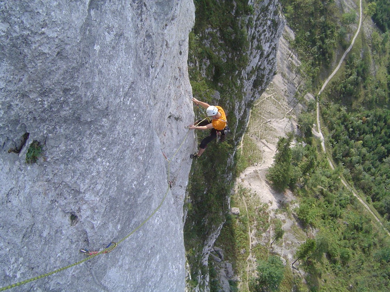 50 m Einfachseil, 18 (!) Expressschlingen für die A0-Variante (wenn man alles einhängt) - ansonst 12, 3 kurze Bandschlingen (+ 1 lange Bandschlinge bei A0-Begehung), Helm