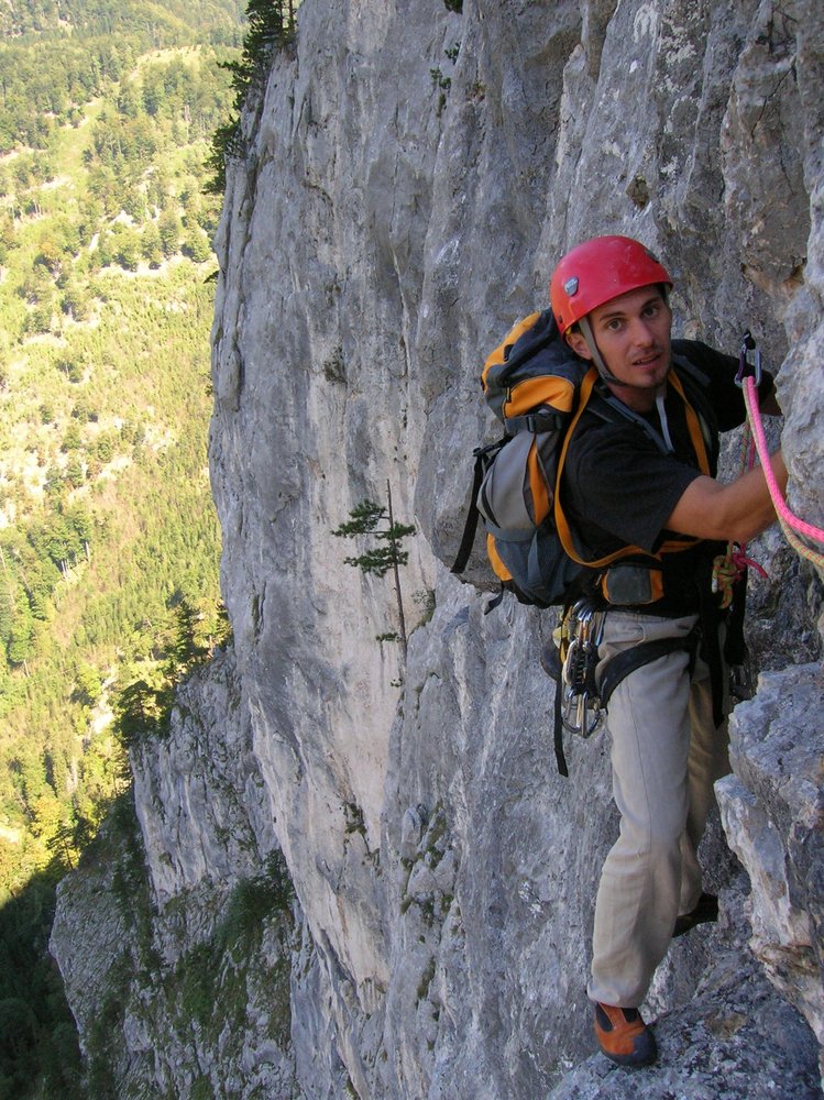 Oben auf Steigspuren zum Wachthüttelkamm (Versicherte Steiganlage) queren, und über diesen zum Parkplatz absteigen. (Alternativ: Über Blechmauernsteig zurück zum Rucksack, 1. bis 2. Grad).