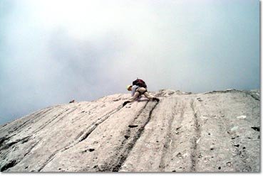 Die Himmelsleiter ist die wohl am meisten begangene Route in der Hochschwab Suedwand (die Seilschaften sind manchmal von unten bis oben aufgefaedelt). Trotzdem diese Route neben der Wetzsteinplatte sicher das Beste, was der "Schwab" zu bieten hat (die Route geht eigentlich gar nicht auf den Hochschwab sondern auf den Kleinen Schwab, der Gipfel ist ca. 100 m entfernt). Die Route verläuft ueber Platten die mit Wasserrillen übersät sind, und wird nur durch 3 eher unschöne Seillängen (keine Platten) unterbrochen. Die Route ist an den Ständen und ganz vereinzelt auch dazwischen mit Bolts abgesichert, sonst wird an Normalhaken und Klemmkeilen gesichert.