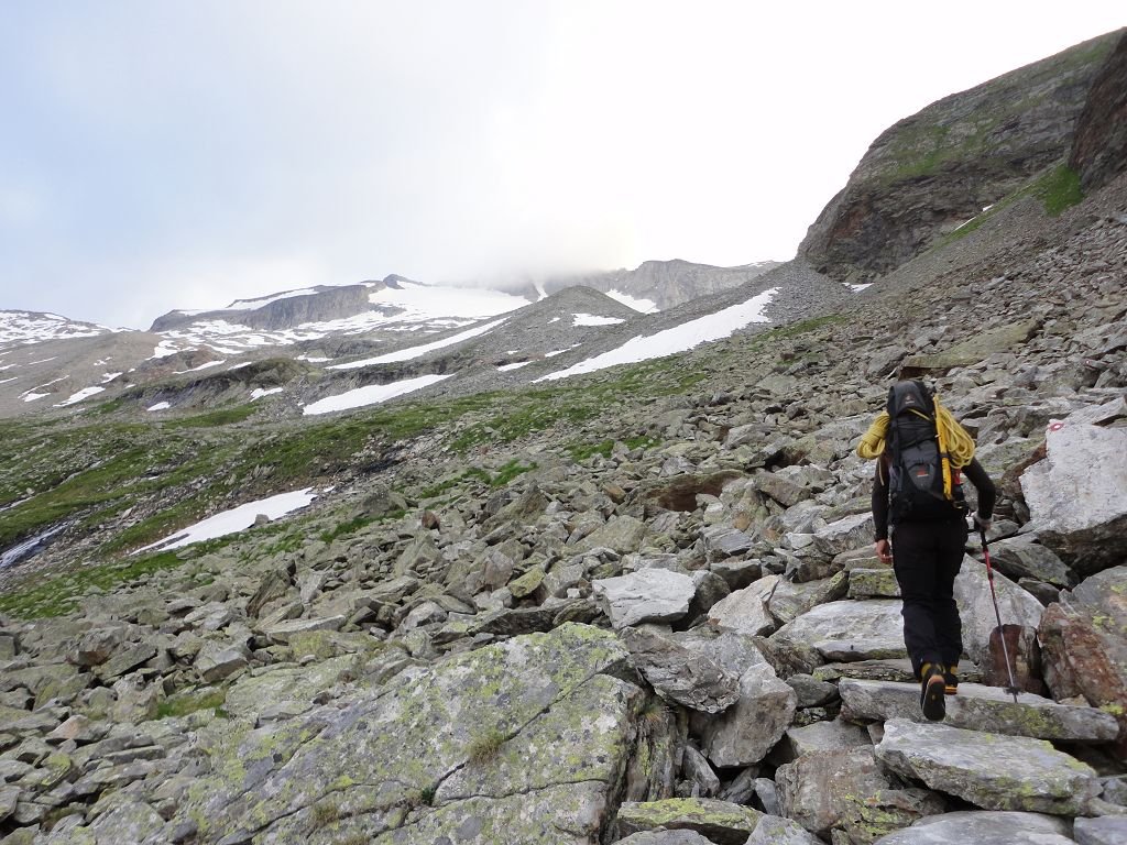 Im Spätsommer bzw. bei weiterer Ausaperung des Gletschers besser über den Detmolder Grat absteigen! (siehe dazu auch GPS Track!)