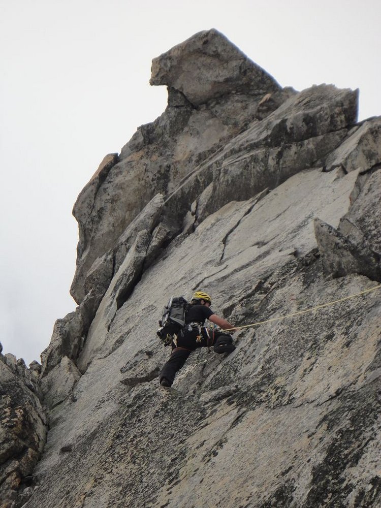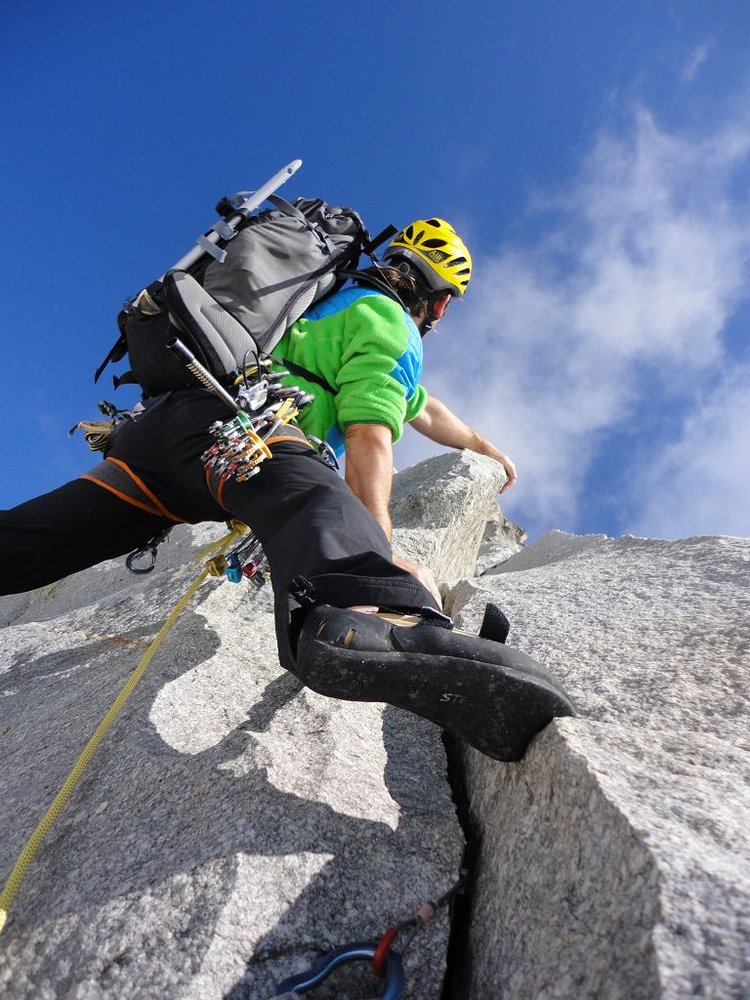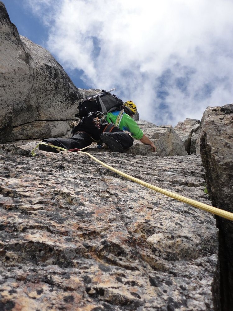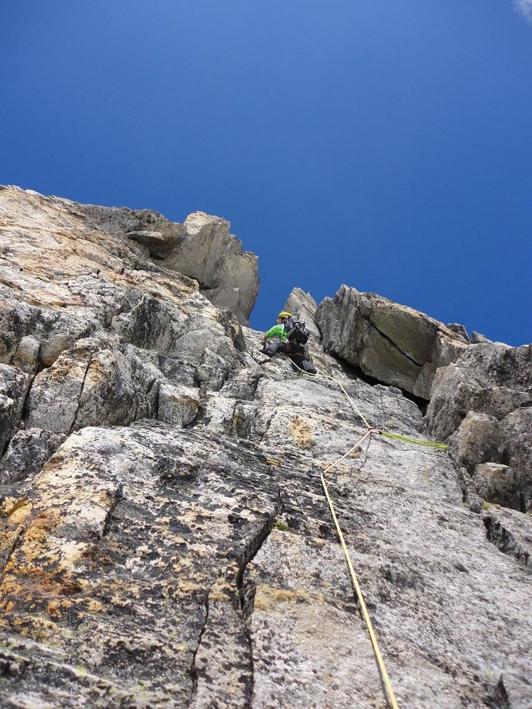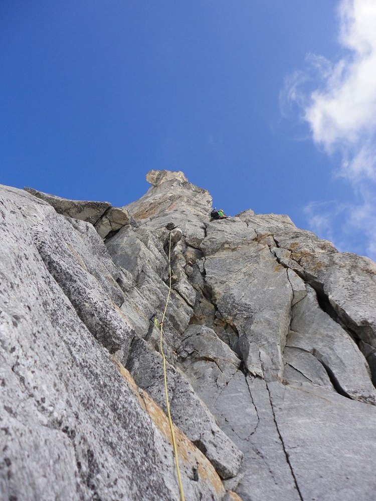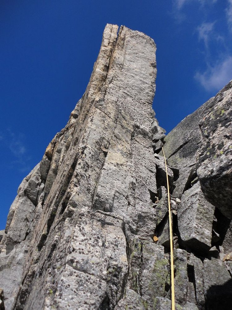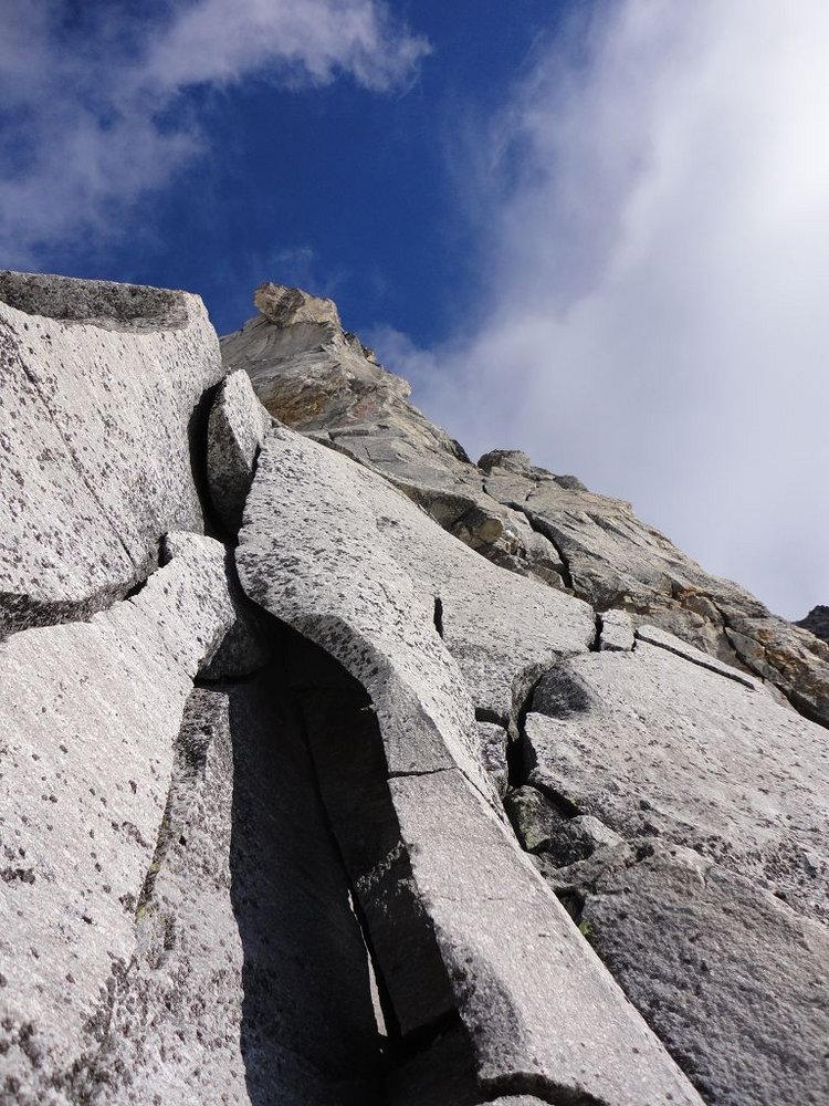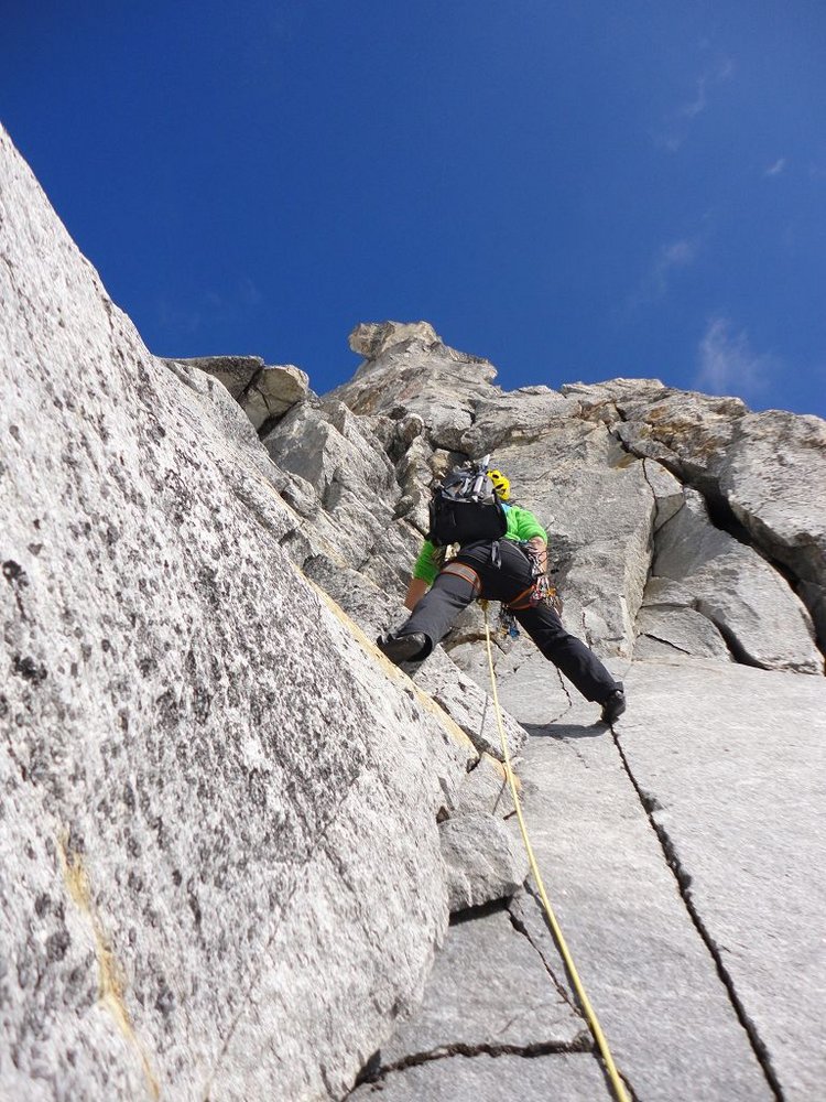 Der Südpfeiler bietet Kletterei in seiner ursprünglichsten Form, nur sporadisch findet man Normalhaken und die Standplätze sind selbst zu bauen. Der Fels besteht aus kompaktem Gneis und so verwundert es nicht, dass die Absicherungsmöglichkeiten mit Keilen und Friends sehr gut sind.