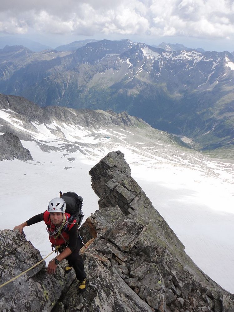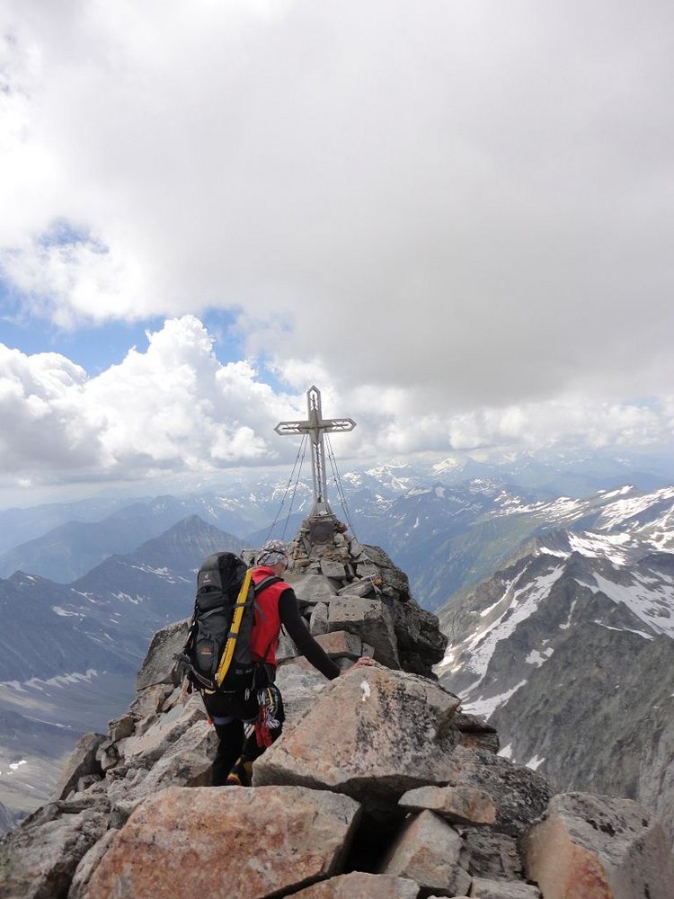 Sehr schöne Klettertour in hochalpiner Umgebung. Die Besteigung der „Tauernkönigin“ über den Südgrat ist ein Gesamterlebnis. Vom Wandern über Gletscherquerungen, alpiner Kletterei und Klettersteig ist alles mit dabei.