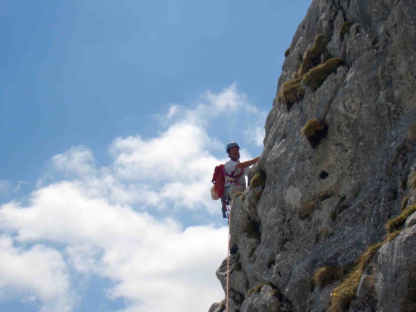 5.SL 40m 4,3+ kurz nach links queren auf grasigem Band, gerade die Wand empor mit Abschlussüberhang, über grasdurchsetzte Felswülste zum Schlussstand.