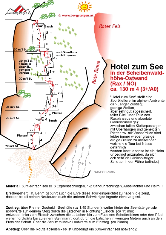 "Hotel zum See" stellt eine Sportkletterei im alpinen Ambiente dar (Langer Zustieg; grasige Stellen, aber sehr gut abgesichert, toller Blick über Teile des Raxplateaus und absolute Genussruhelage):