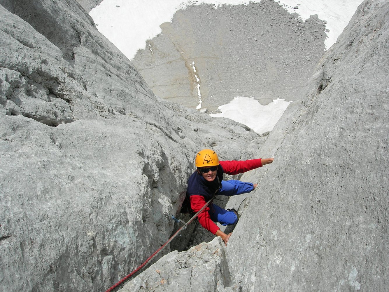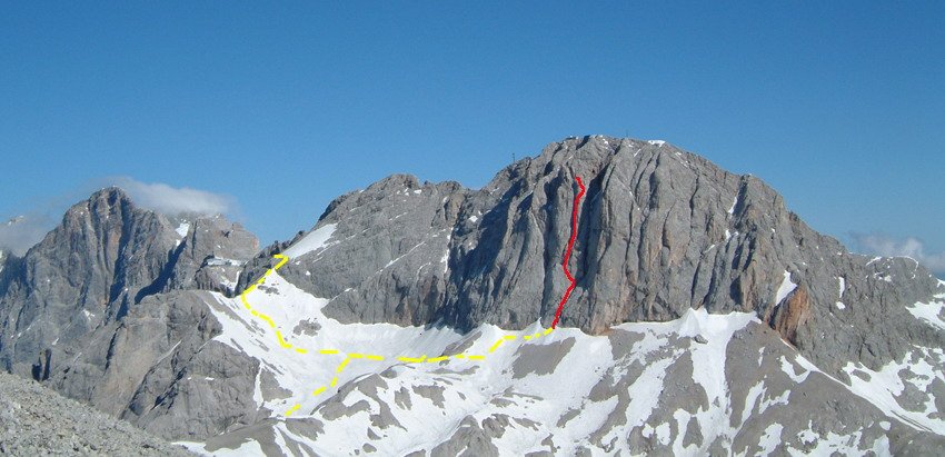 Der Einstieg ist am tiefsten Punkt der gr. Verschneidung, die den Süd- u. Südostpfeiler trennt. Links daneben ist die Tour "Idealpfeiler".
