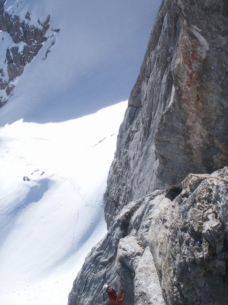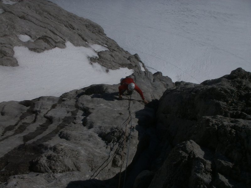 Über Abseilpiste (Achtung! sie ist neben der Tour siehe Topo!!). zum Einstieg und entweder wie Zustieg zur Bergstation oder in 1, 5 Std. über das Edelgrießkar zurück.