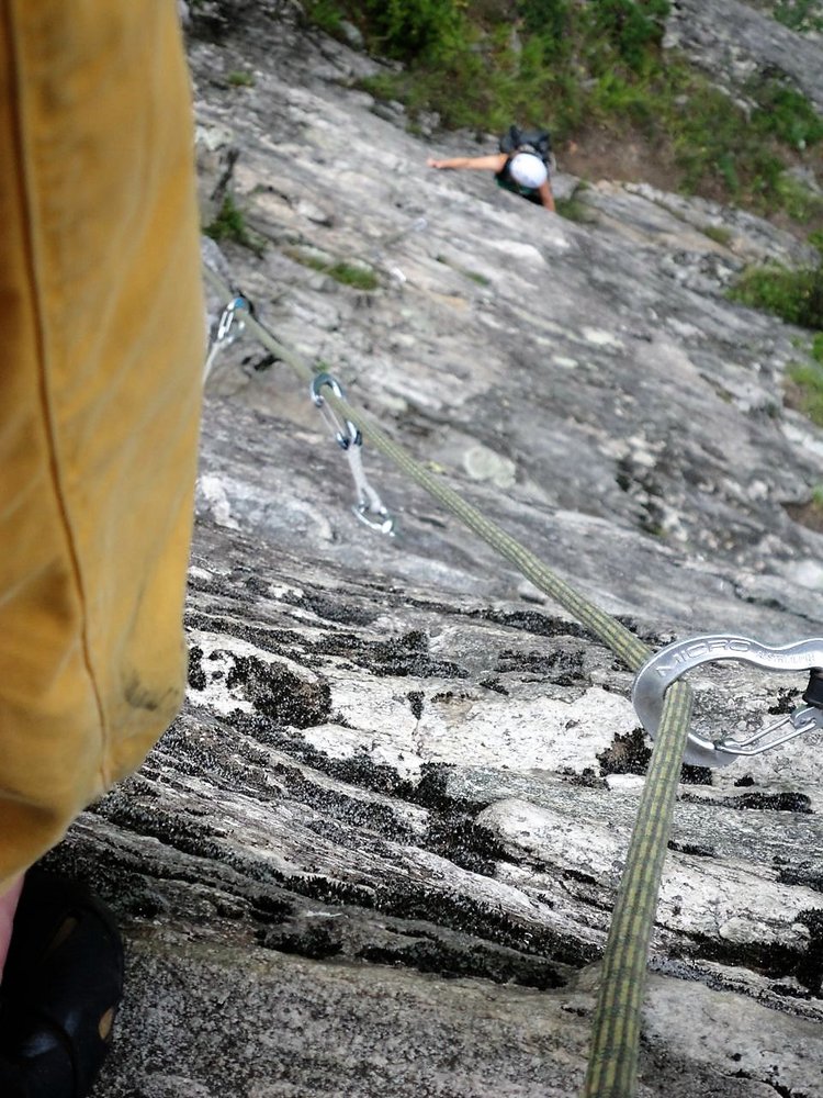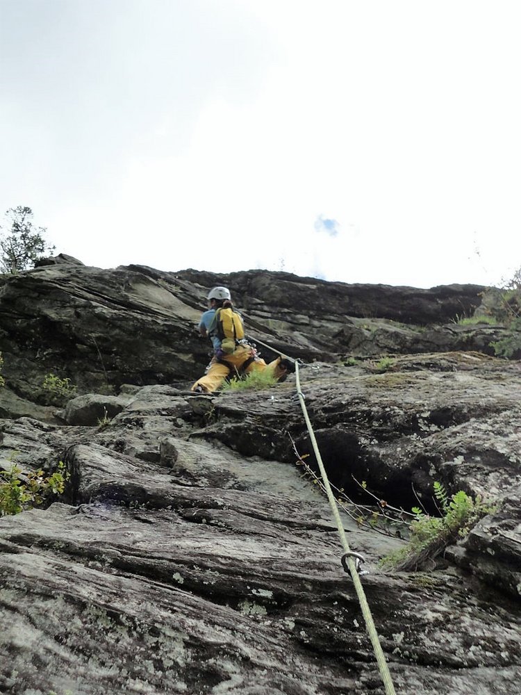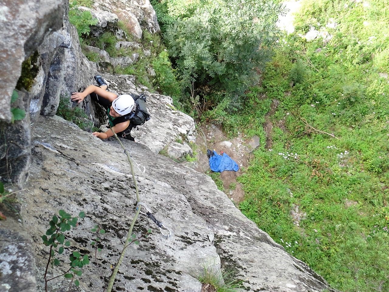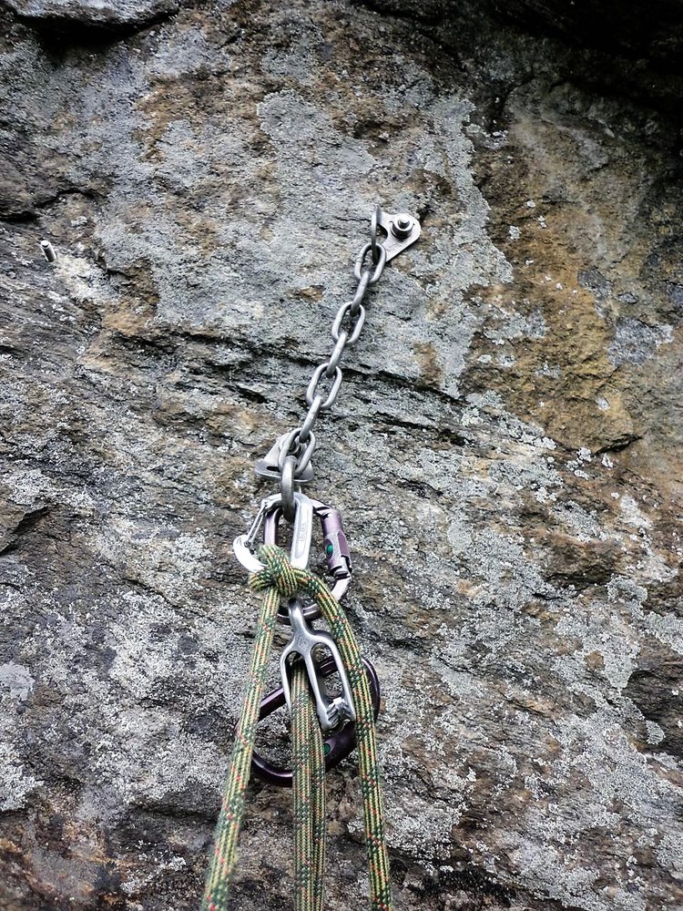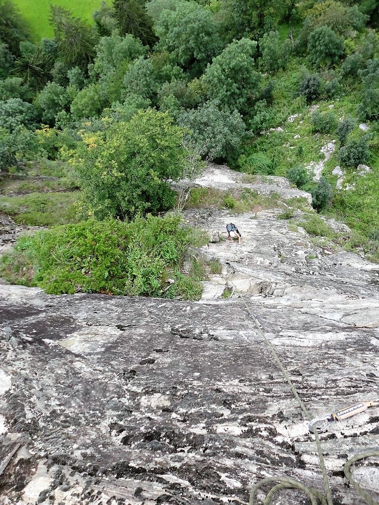 Abseilen über den Humuspfeiler. Vom Ausstieg etwa 20m auf Wegspuren zu Baum mit Bandschlinge und Rapidglied. Von diesem 10m zum Stand direkt UNTERHALB der Felskante abseilen (den Bohrhakenstand oberhalb der Kante lässt man am besten links liegen). Von dort 2x50m über den Humuspfeiler abseilen.