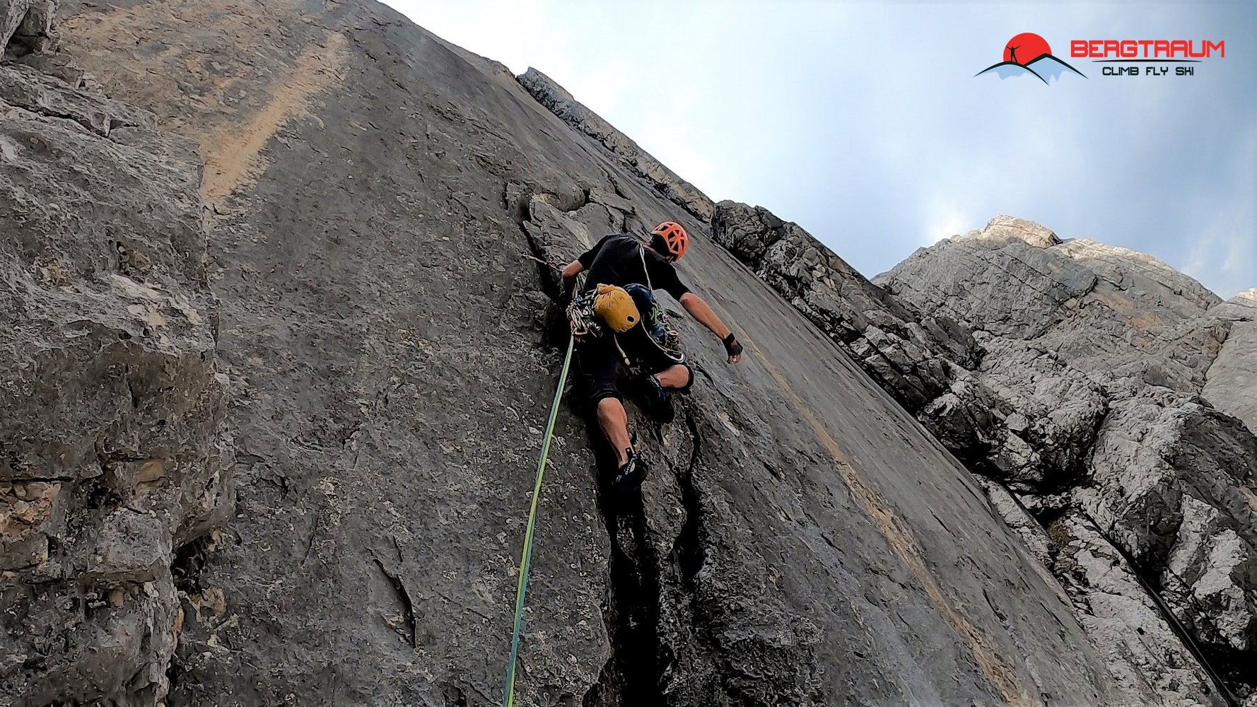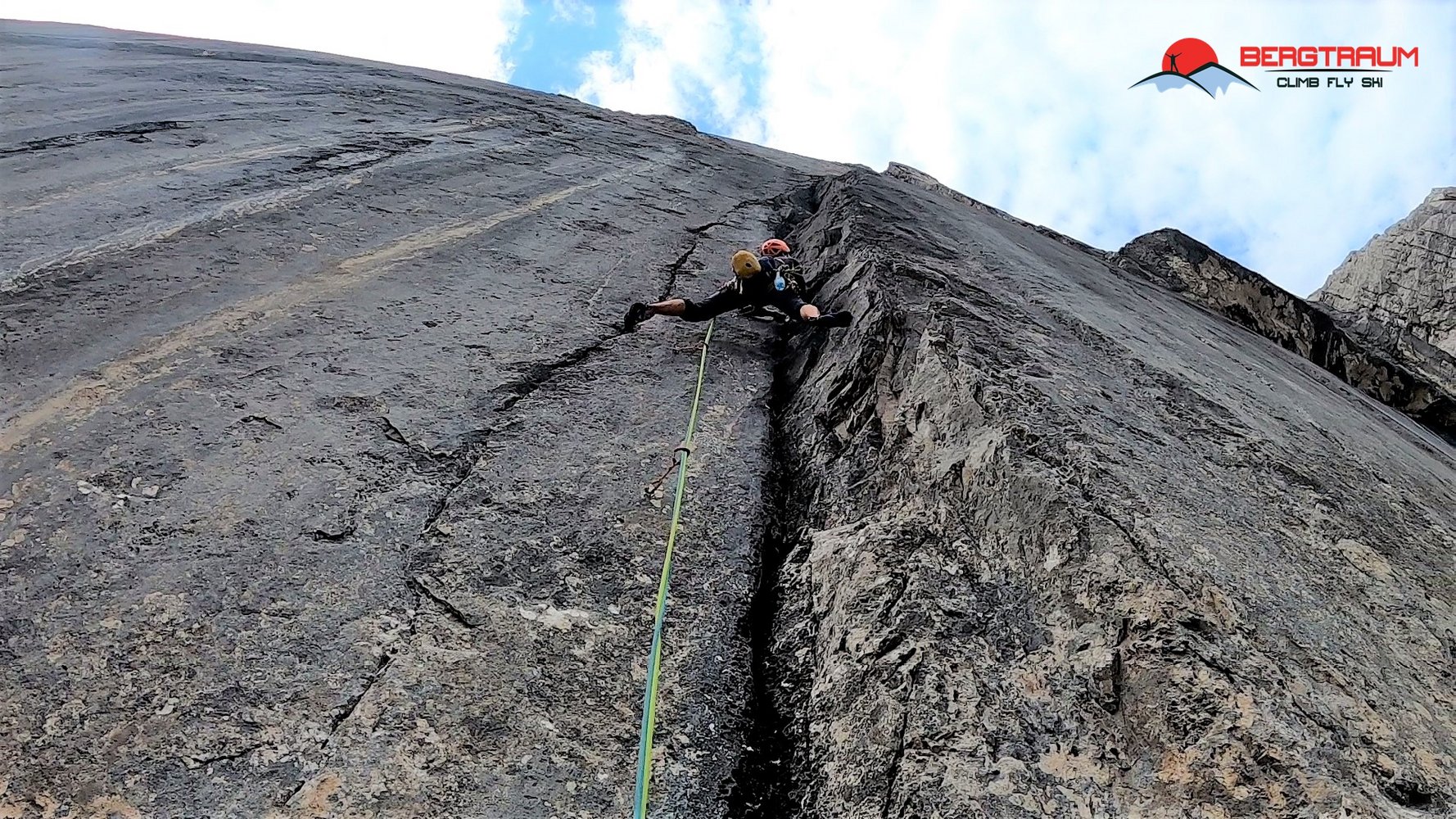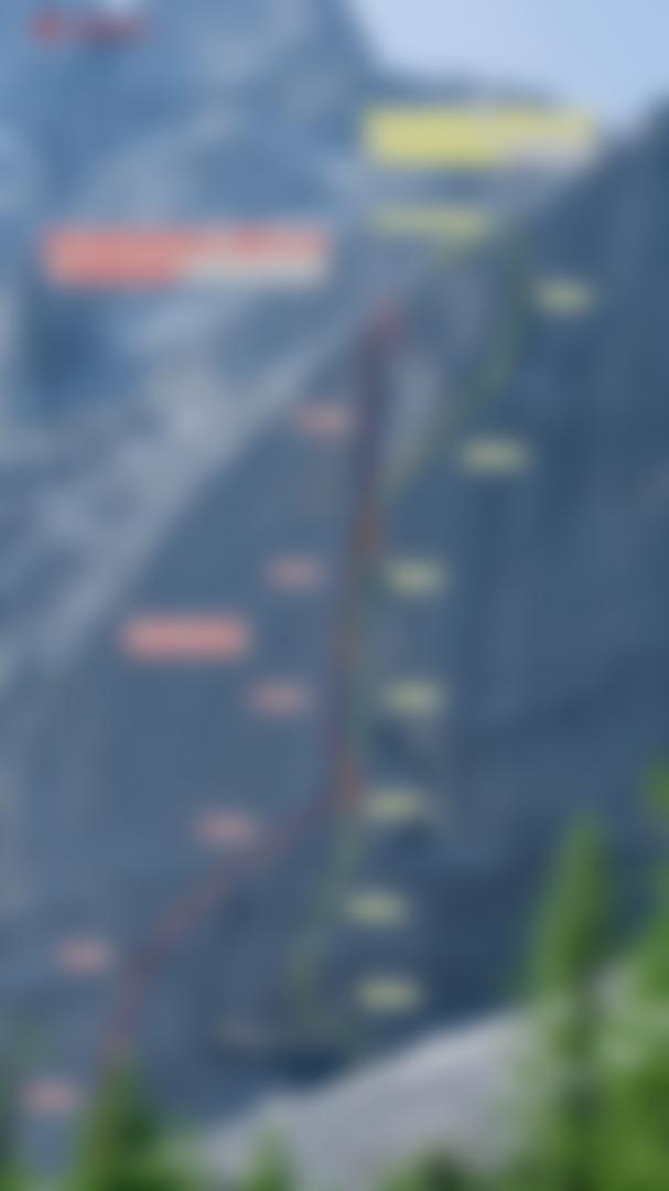 Der Einstieg startet gleich mit einer bockharten 8- Länge, Die zweite Seillänge wird ein wenig leichter entlang eines Risses zu gutem Absatz rauf. Die dritte Länge führt fetzgeil nach rechts oben. Die nun folgenden beiden Längen in der Dachrinne erübrigen eine Beschreibung. Der Ausstieg entlang des folgenden 60 Meter Kamins kann auch in zwei Längen geteilt werden (Zwischenstand nach 25 Meter vorhanden).