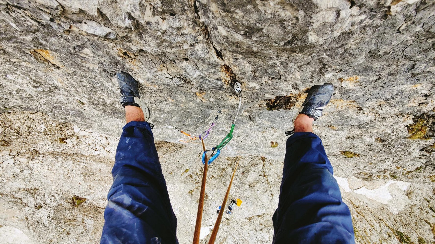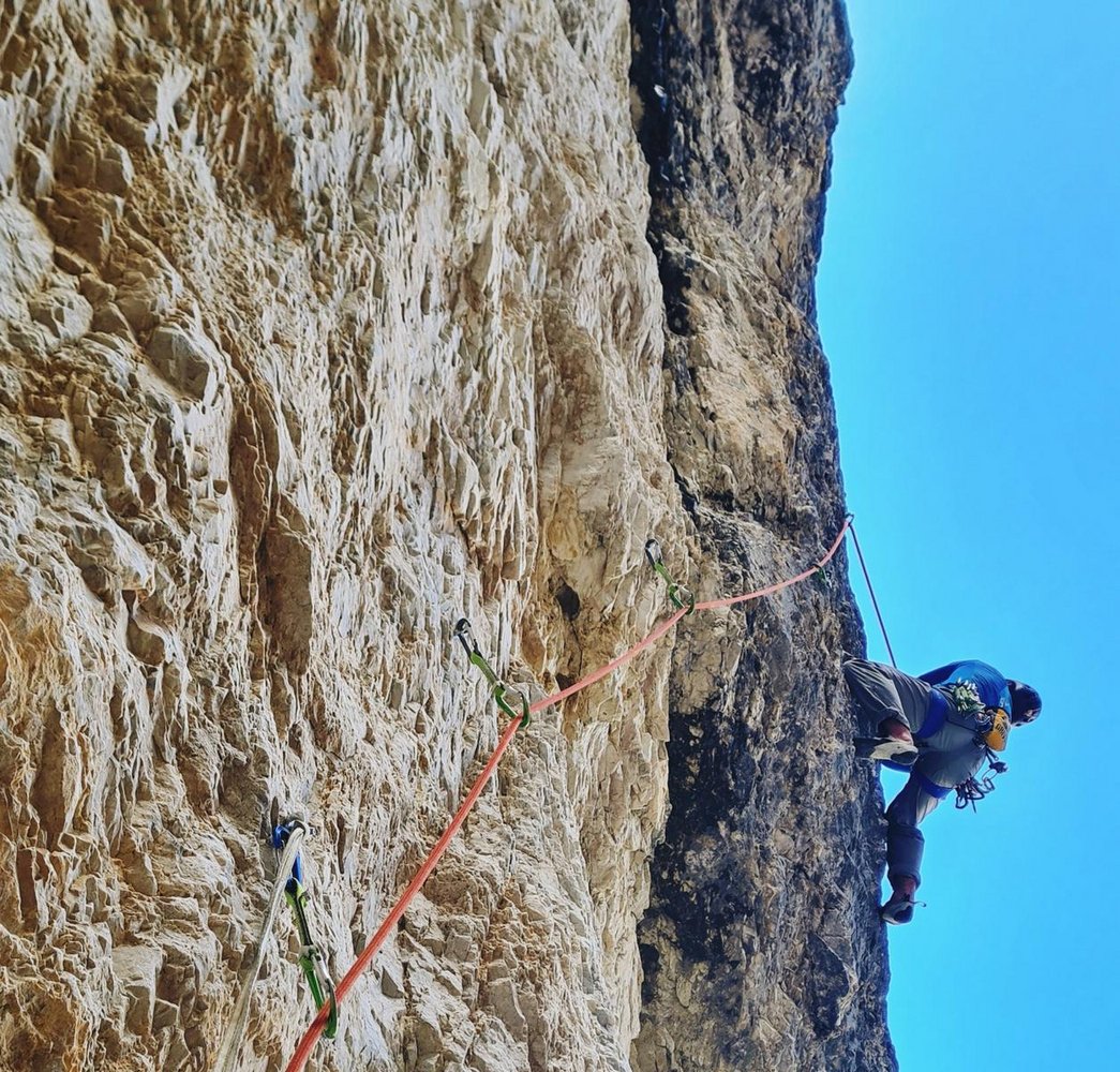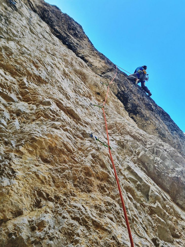 Absicherung: ausschließlich Bohrhaken – S2 (Größerer Hakenabstand mit zwingenden Kletterpassagen. Potenzielle Sturzlänge beträgt höchstens 10 Meter und Sturz hat keine Verletzungen zur Folge).