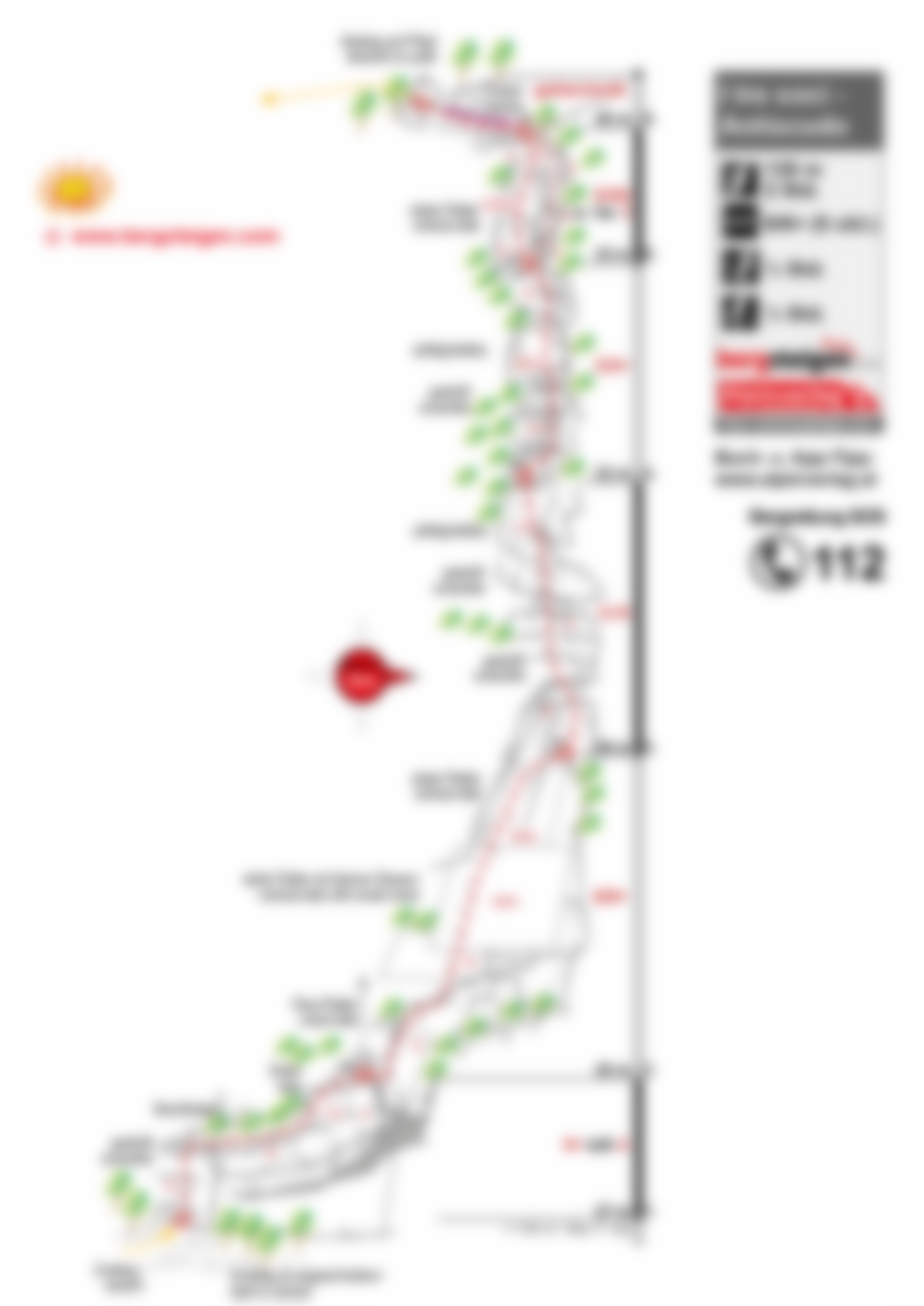Oben entlang des Fixseils über die Schrofen nach links, dann auf dem breiten Felsband auf Pfadspuren links absteigen. Das Gelände wird steiler und verläuft über Platten - dort genau auf den Pfad und Steinmännchen (Markierung) achten, am Ende eine kurze, etwas ausgesetzte Plattenquerung zum Schutt. Vom Schuttfeld auf Pfadspuren hinunter zum Schotterradweg und auf diesem zurück zum Ausgangspunkt.