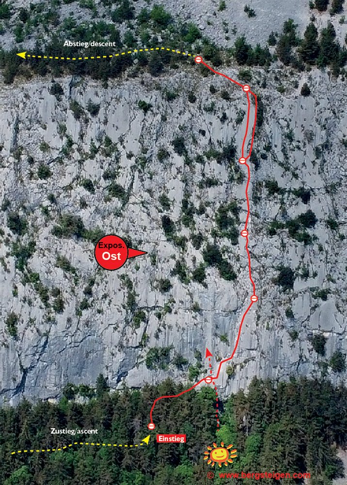 Achtung: Die kurze Plattenpassage beim Abstieg ist bei Nässe heikel (es stecken aber Bohrhaken, man kann sich bei Bedarf sichern)!