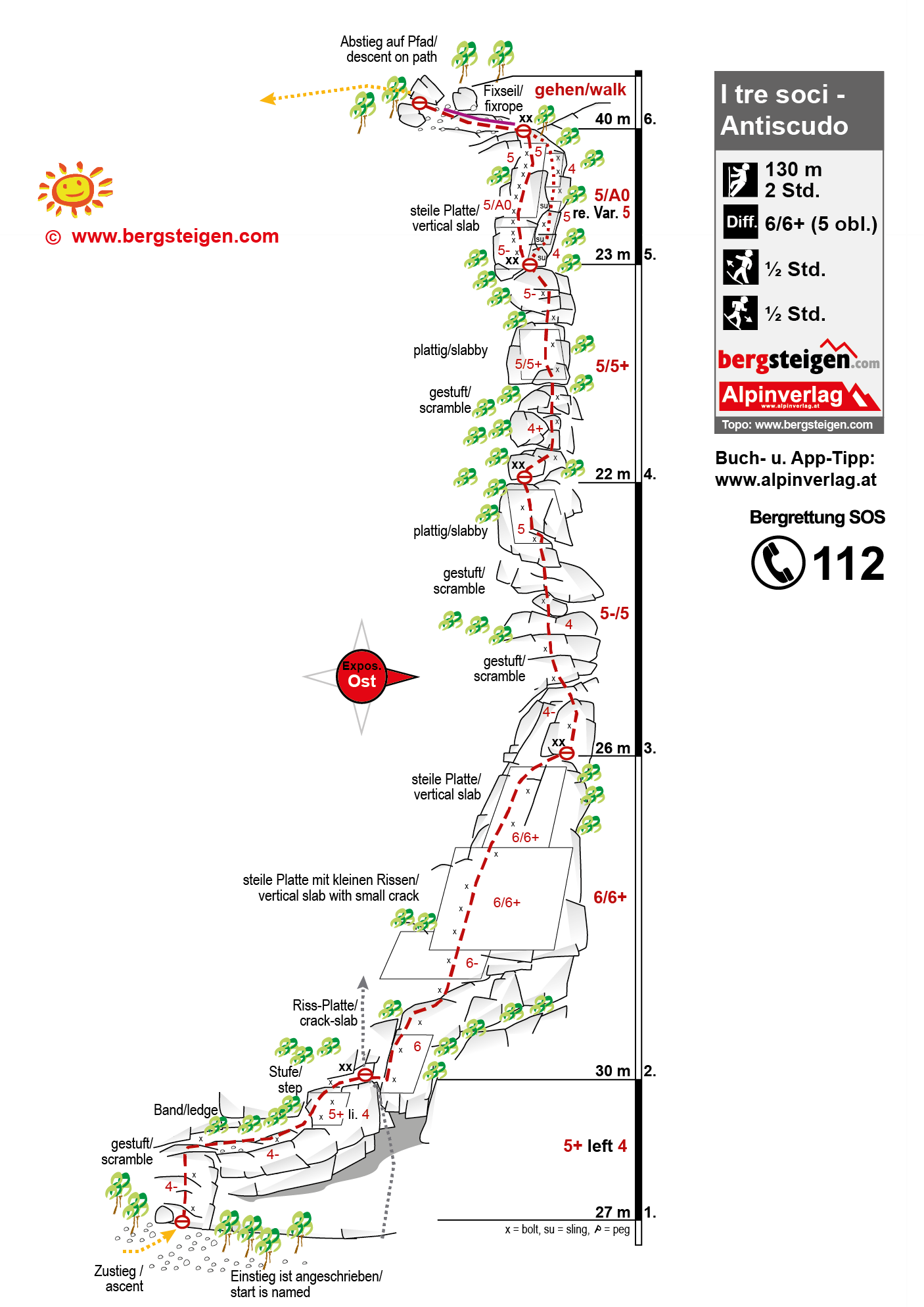Die Route I tre soci (die drei Freunde) ist eine sehr gut gemachte Plaisirroute an der Antiscudo Felswand am Wandfuß der Cima alle Coste. Diese Route ist die leichteste Plaisirtour an der Parete Antiscudo und eine schöne Bereicherung für diese Felswand. Durch die üppige Bohrhakenabsicherung ist der Anstieg auch für reine Sportkletterer zu empfehlen - etwas Trittsicherheit sollte man für den Abstieg (kurze Plattenpassage) aber haben.