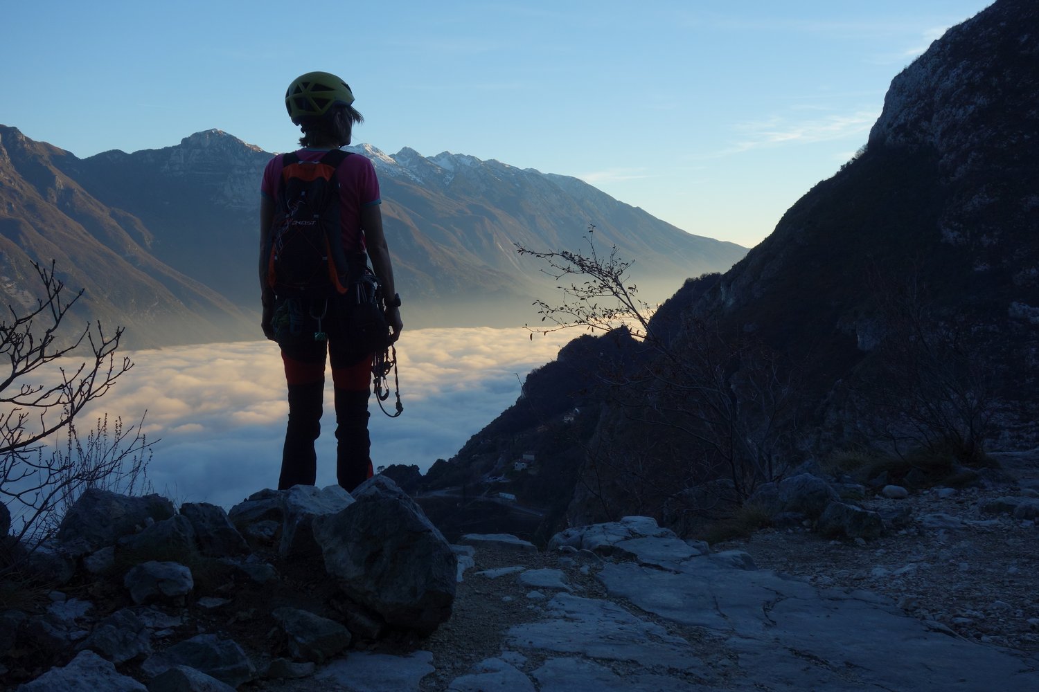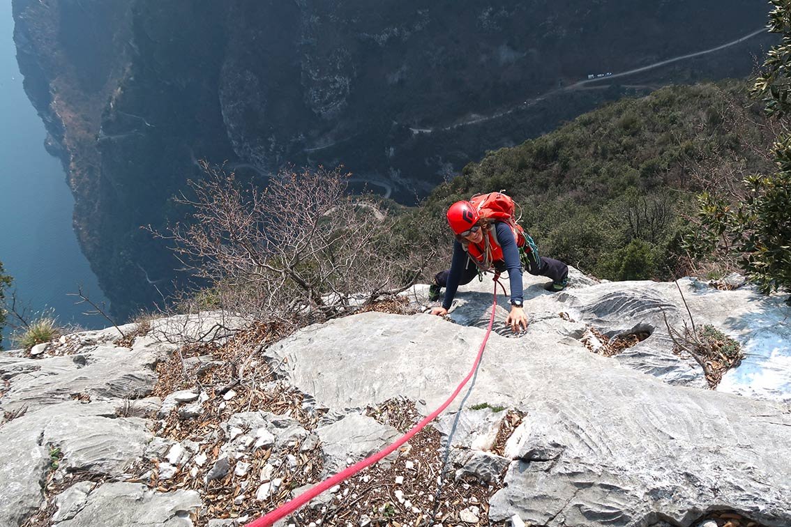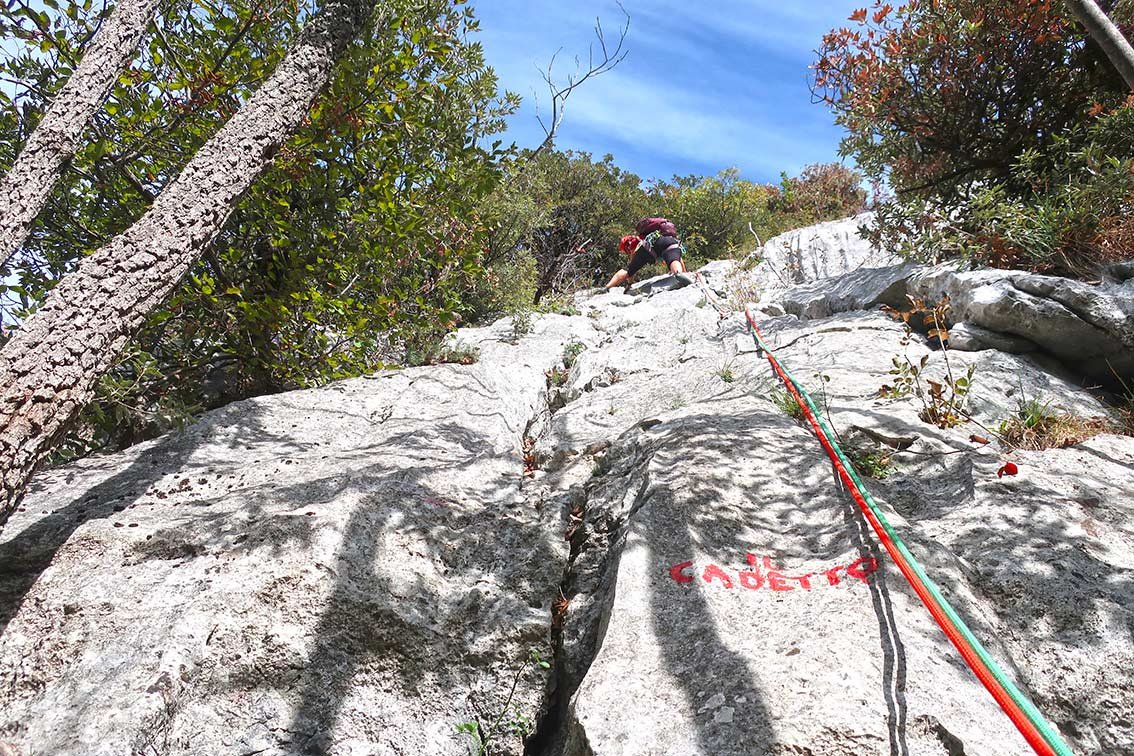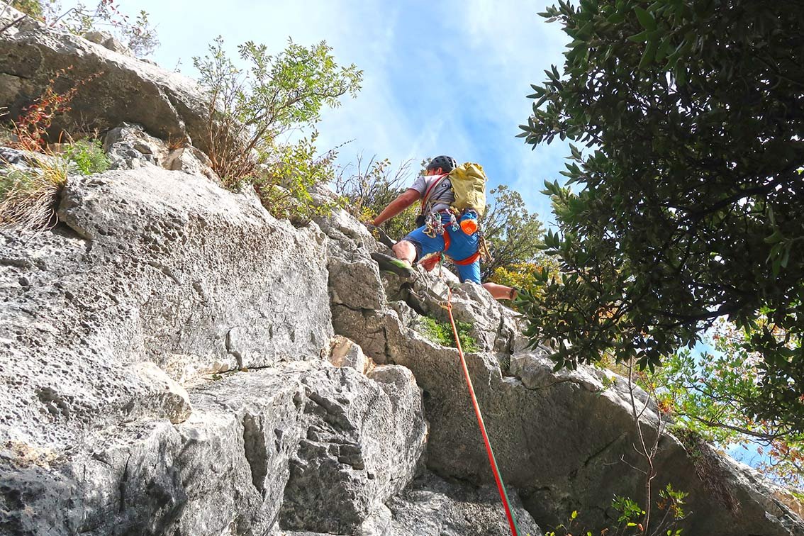 Da die Sektoren oft übereinander liegen (siehe Vorschläge/Topos auf dieser Seite oder unsere Kombination: Caino e Abele, 5 SL, 6-; Zio Genio, 3 SL, 6-; Il Cadetto, 6 SL, 6-; Fausto Susatti Klettersteig, 200 Hm, B), lässt sich ein kurzer Dezembertag locker ohne Zwischenabstieg füllen. So kommen zwar einige SL zusammen, das Ganze wirkt aber nicht so ernst, weil immer wieder waldiges Gehgelände zwischen den Sektoren liegt. Einziges Problem bei einer Vielzahl an Wegspuren zu noch mehr Felsen ist die Orientierung. Oftmals sieht man die nächste Wand vor lauter Bäumen nicht. Aber wenn das geschafft ist findet man dort eine lohnende und oft auch leichtere (weil sehr human bewertet) Alternative zu den Klettereien um Arco und im Sarcatal, allein schon der Tiefblick auf den tief unten liegenden Gardasee ist den Ausflug wert. Die Wände dort sind noch etwas stärker gebändert als beispielsweise San Paolo, was bedeutet, dass man auch während einer Tour immer ein, zwei SL klettert und dann wieder durch den Wald spaziert.