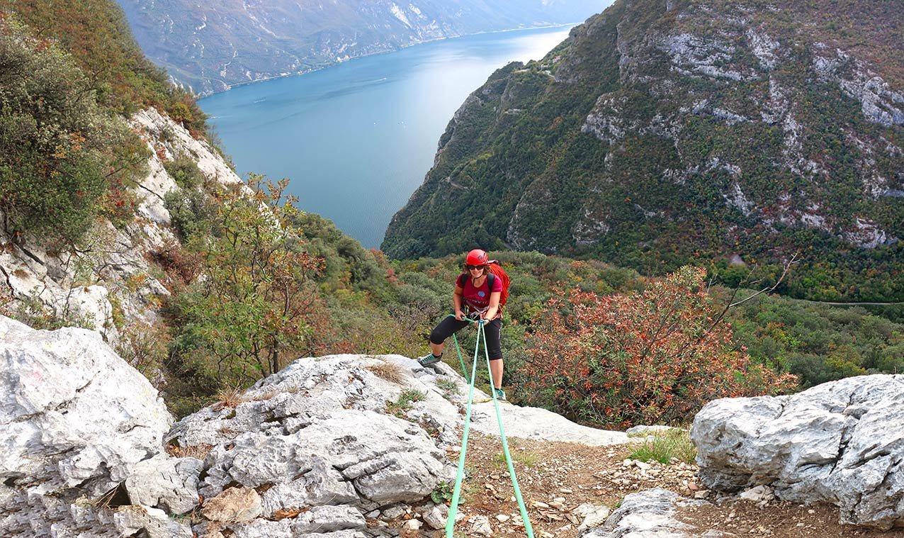 Alternativer, schnellerer Fußabstieg zur alten Ponalestraße (ohne abseilen): Man steigt bei der Ferrata Susatti zuerst steil in Richtung Riva ab, geht dann aber (auf ca. 390 m) auf dem Querweg zurück in Richtung Biacesa. Der Querweg führt unter den mittleren Klettergarten, von dort steigt man zur alten Ponalestraße ab.
