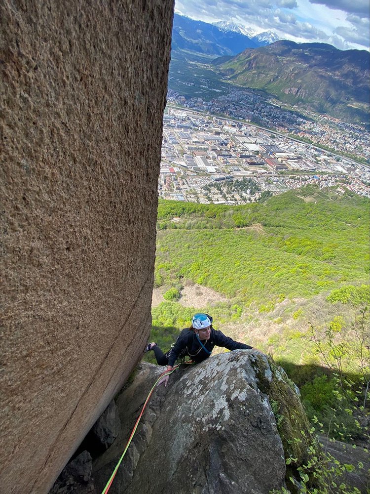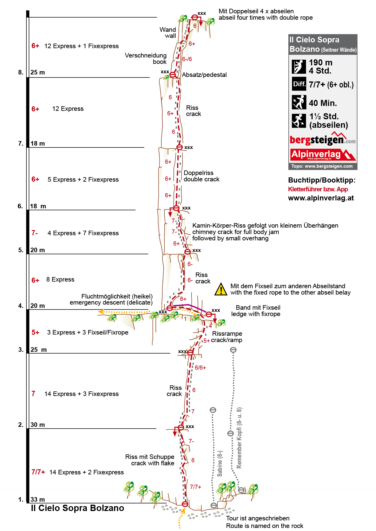 Il Cielo Sopra Bolzano - das ist steiles Plaisriklettern mitten im Trad-Klettergebiet der Seitner Wände. Routen mit Rissen gibt es an den Seitner Wänden viele, nur eine ist aber dermaßen gut abgesichert, dass sie eigentlich gar nicht zu den anderen Klemmkeilrouten passt. Gerade deshalb ist die Route vor den Vorhang zu stellen - klassisches Rissklettern über 8 Seillängen, das ganze perfekt abgesicherte, wo gibt es das schon!