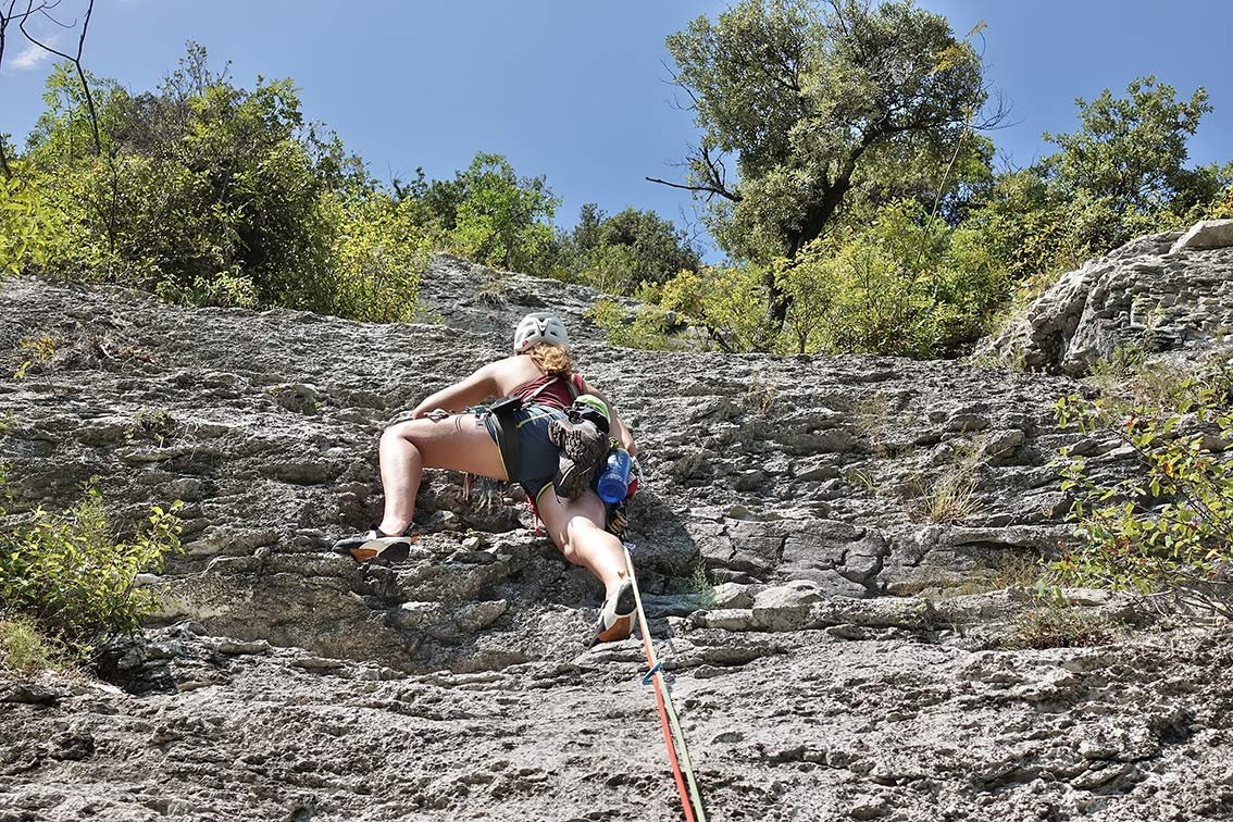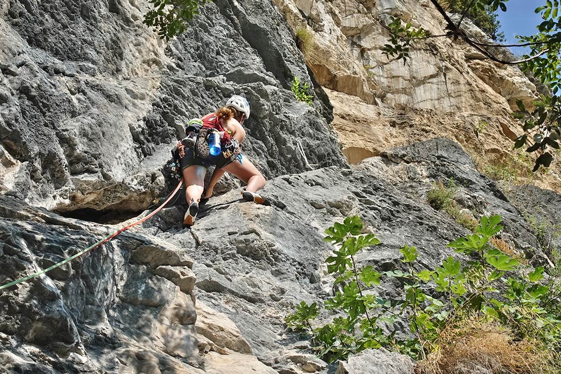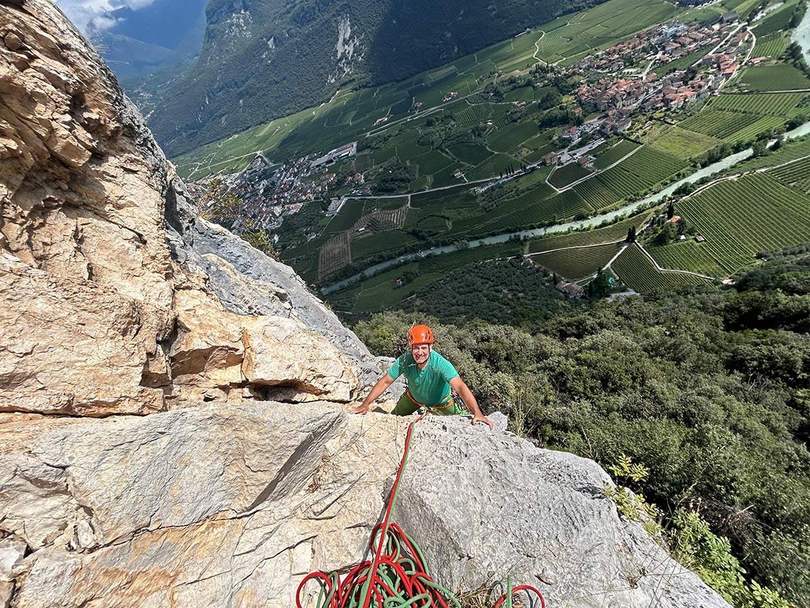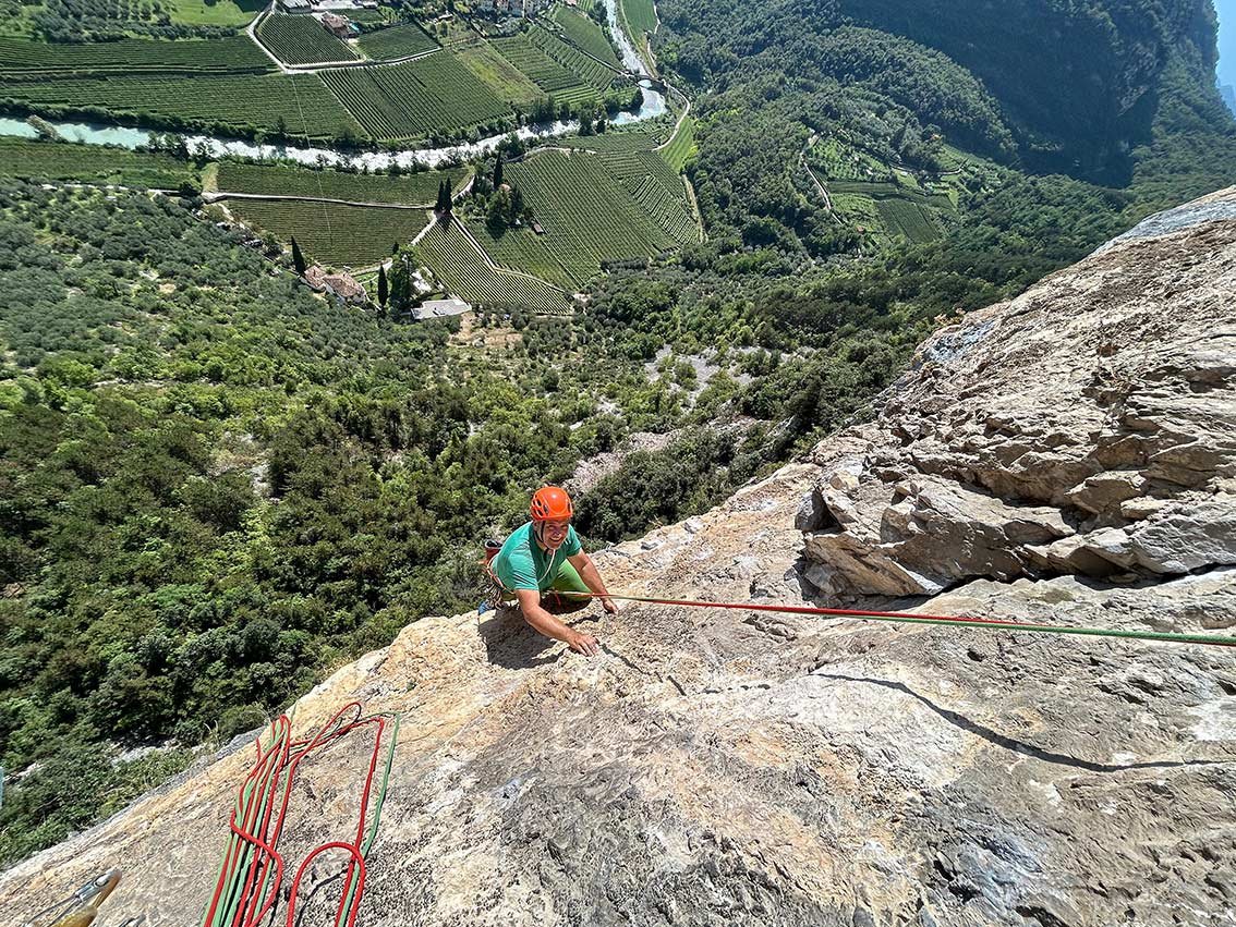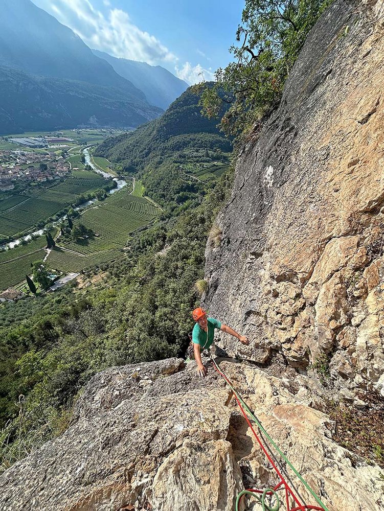 Wer genug Kraft hat, kann sich in der Oksana (7, sehr gut mit Bohrhaken gesichert) warm klettern, vom Ausstieg der Oksana steig man rechts zum Beginn der Il cuore d’oro ab.