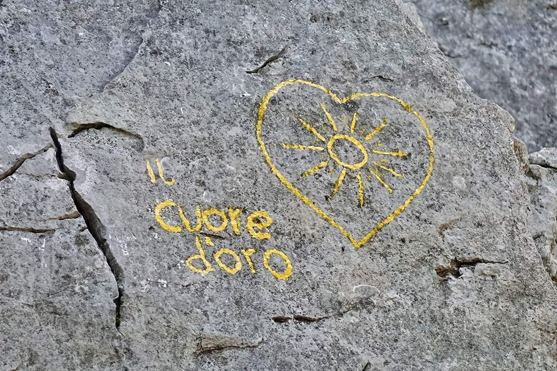 Die Il Curore d Oro ist eine fantastische Alpin-Route mitten durch eine überhängende Wandzone oberhalb des Sentiero degli Scaloni. An Dellen, Platten und kleinen Überhängen schwindelt man sich im Zickzack durch das Herz in der überhängenden Wand. Der Fels ist bis auf wenige Ausnahmen sehr gut. Die Route beginnt mit einer roten Rampe, dann das Zickzack durch das Herz, es folgen graue, etwas mit Botanik bewachsene Platten und am Ende klettert man einen schönen "goldenen" Pfeiler zum Ausstieg. Die Tour durch das "goldene Herz" ist eine der Arco-Touren, die man als Alpin-Kletter-Touren-Liebhaber gemacht haben sollte.