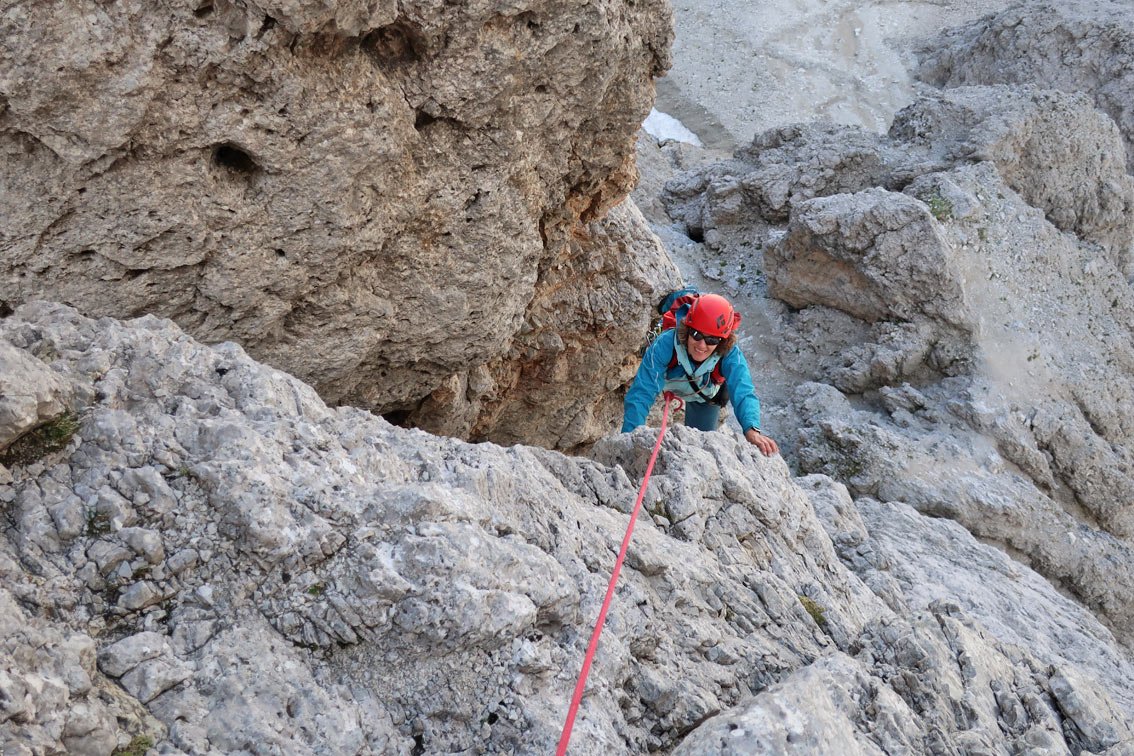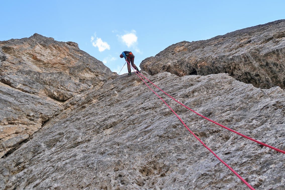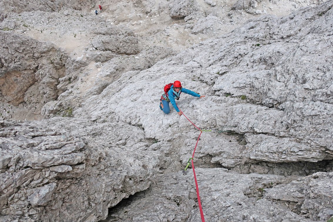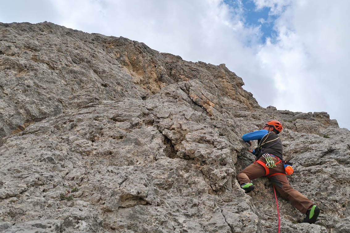 Recht luftige und ausgesetzte Kletterei, die einen perfekten Einstand in das Dolomiten-Klettern bietet!