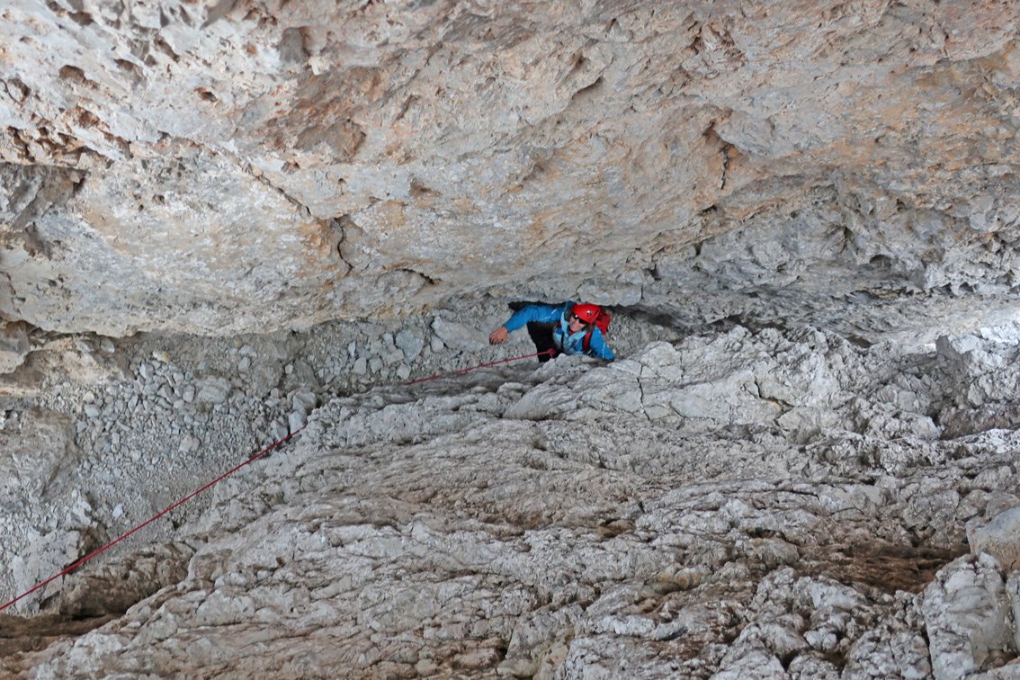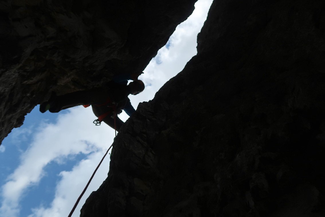 Über Platten aufwärts zu Bohrhaken und SU, dann rechts vorbei an Bohrhaken hinauf zu Standplatz. Vom Standplatz rechts in den Kamin, in diesem gehend bis zum Ende (andere Seite). Dort ist links ein pfeilerartiger Block mit SU. Auf diesen hinauf steigen, dann links auf Rampe an der linken, sehr ausgesetzten Kaminwand zu Standplatz an Ringhaken. Vom Stand an die Kamin-Außenseite und bei Bohrhaken um die Ecke und leicht hinauf zu Standplatz auf einem Absatz. Vom Standplatz Spreizschritt zurück zum Il Gobbo Turm und bei Bohhaken ansteigend in leichteres Gelände zu Stand am Ende einer kleinen Rissrinne. Vom Stand leicht rechts an Rissschuppe hinauf und dann ansteigende Rechtsquerung zum Grat. Auf dem schmalen, aber leichten Grat zum letzten Standplatz.