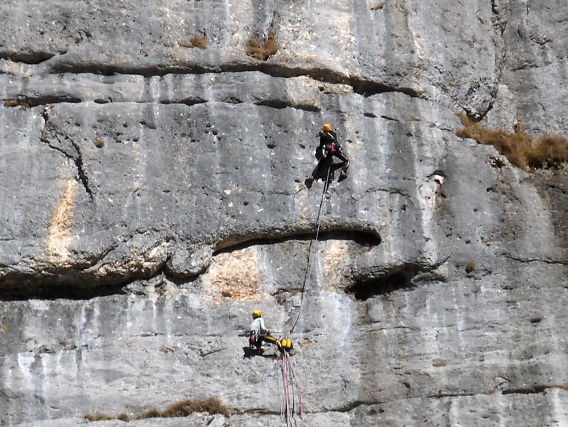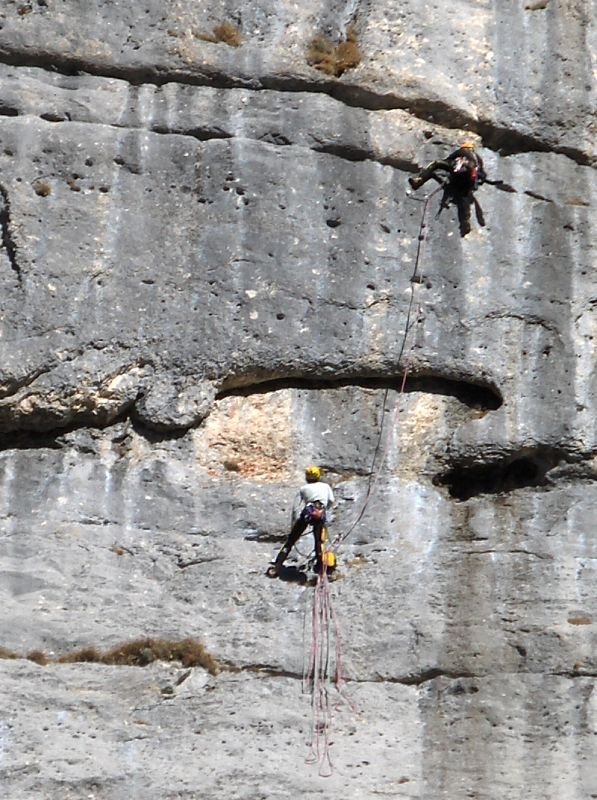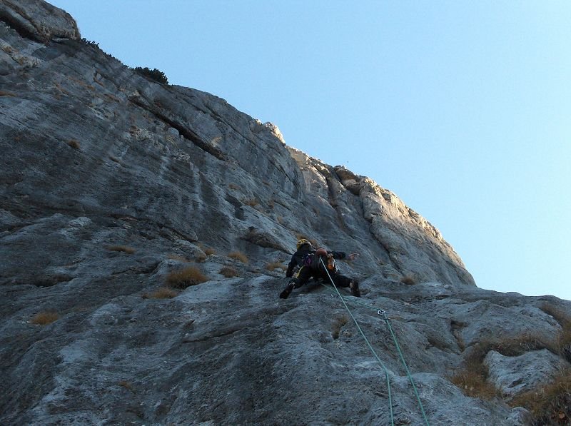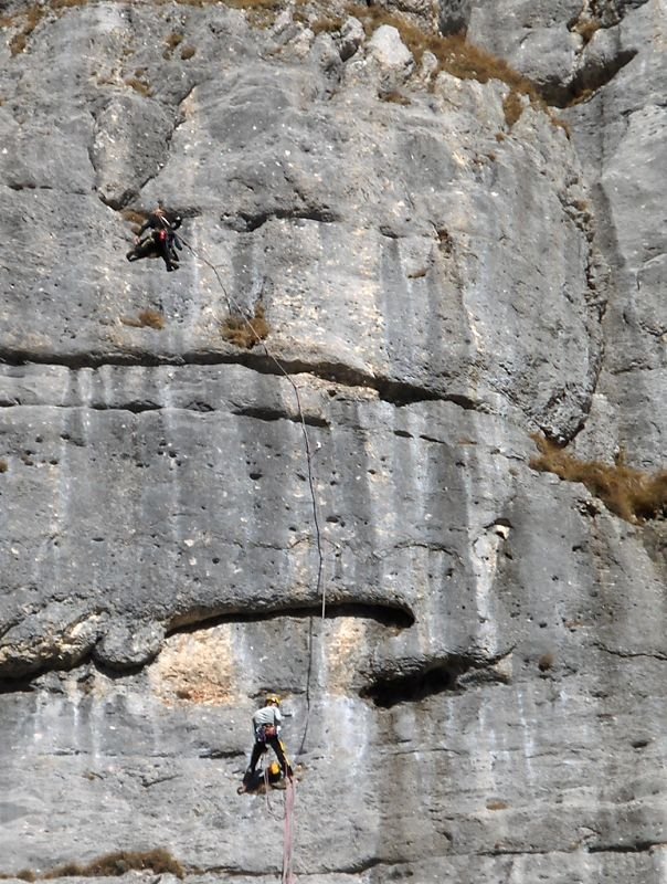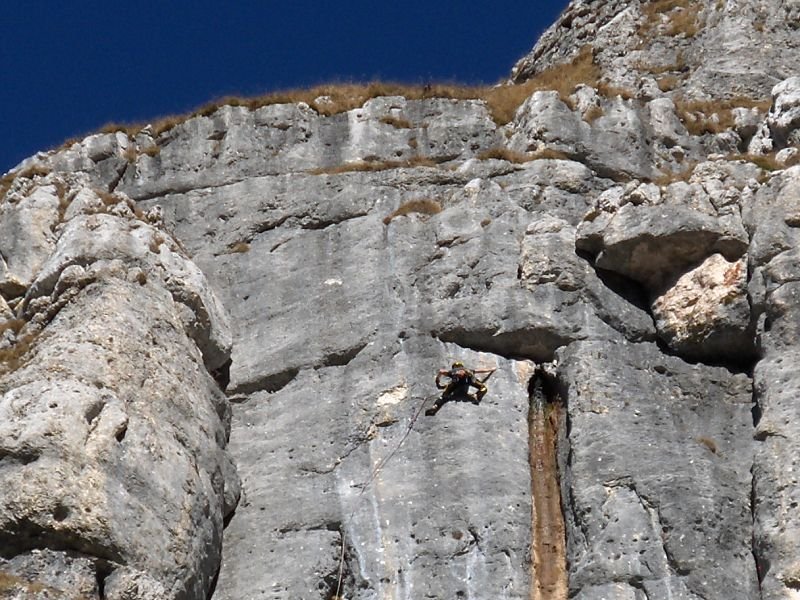 Vom letzten Stand gerade hinunter Abseilen über die Route „Doccia Fredda“ (am besten mit 60m-Doppelseil, der Abseiler vom Zwischenstand wurde von uns nicht saniert). Am großen Band etwa 30m orografisch nach rechts zu letzter Abseilstelle an SU (siehe auch Topo).