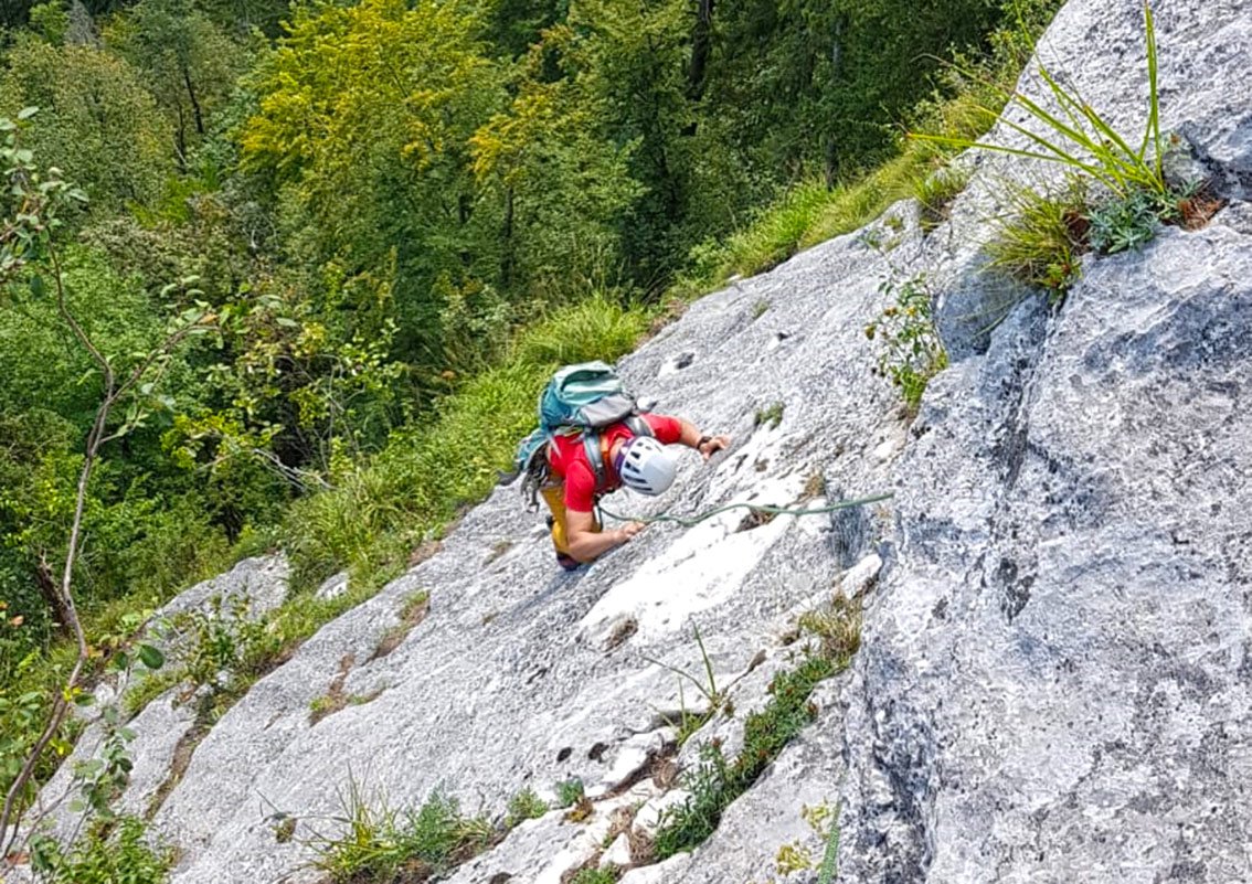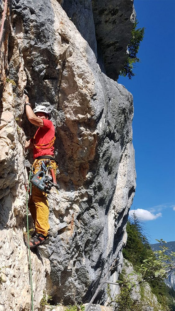 60 m Doppelseil, 12 Expressschlingen, Abseilgerät und Helm.