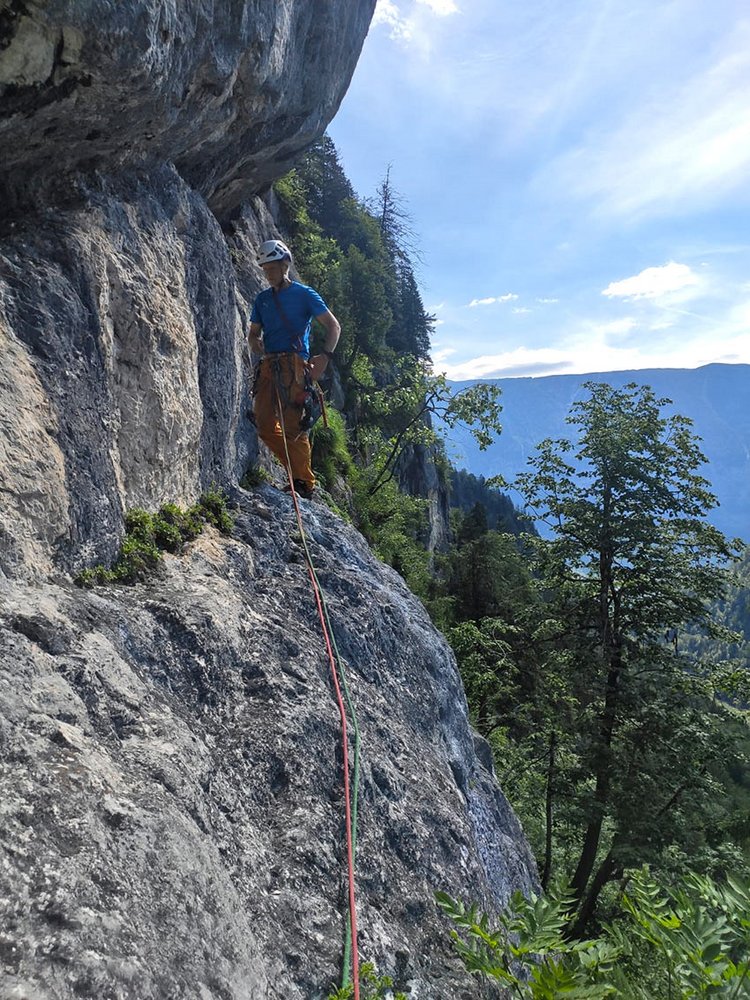 Nach der "Grasrampe" der letzten Seillänge erreicht man einen schönen Wiesenabsatz. Von diesem hinter einem großen Haselstrauch talauswärts, Richtung Hallstättersee, bis man im Schrofengelände einen Abseilring entdeckt. Einige Meter oberhalb der Wand an einem kleinen Baum weiter abseilen zum vorletzten Stand der Route. Weiter in direkter Linie 2 x bis zum ersten Stand abseilen.