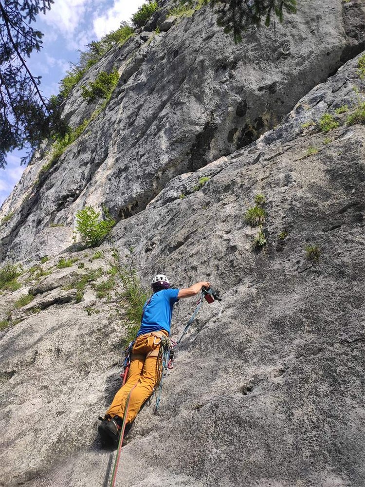 Schöne Mehrseillängetour oberhalb der B166 Bundestraße. Die Route führt über den ersten Steilaufschwung an wasserzerfressenem Fels auf einen kompakten Plattensockel. Durch einen Quergang unter einer Dachzone wird der markante Riss erreicht. Diesen benützt man im weiterer Folge in etwas alpinem völlig, anderem Ambiente als in den unteren Seillängen.