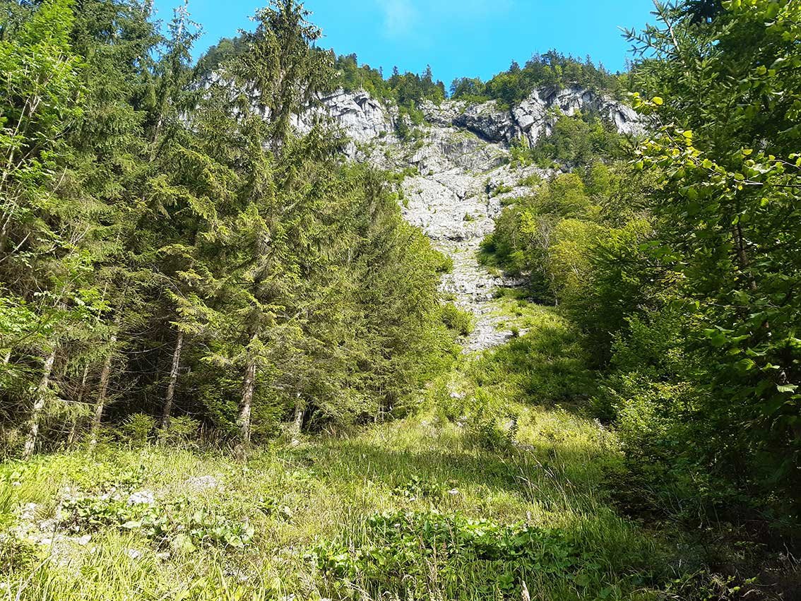 Vom Parkplatz hinunter zum Gosaubach und auf einem Steeg über den Bach. Auf der orogr. linken Bachseite einige hundert Meter auf gut sichtbaren Jagdsteig aufwärts bis man zu einem Hochstand unter einer Schneise kommt. Von nun an nur noch Steigspuren. Am Hochstand vorbei und ca. hundert Meter in der Schneise aufwärts und dann am linken Rand in den Hochwald (Steinmann). Im Hochwald links von der Schneise durch ein ausgetrocknetes Bachbett weiter in Serpentinen weiter hoch. Steinmänner und aufgestellte Stöcke. Nach ca. 25 min erreicht man einen markanten Absatz von dem man in die Schneise einsehen kann. Nun linkshaltend weiter unter eine kleine Felsstufe und mühsam steil, erdig und felsig zum Einstieg, zuletzt 5 m 1 - 2, bei einer großen Buche. Absatz, Einstiegshaken.