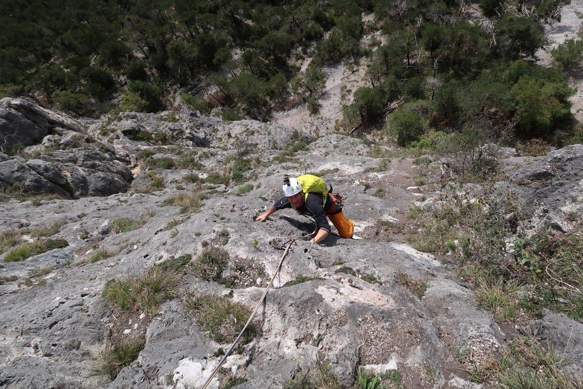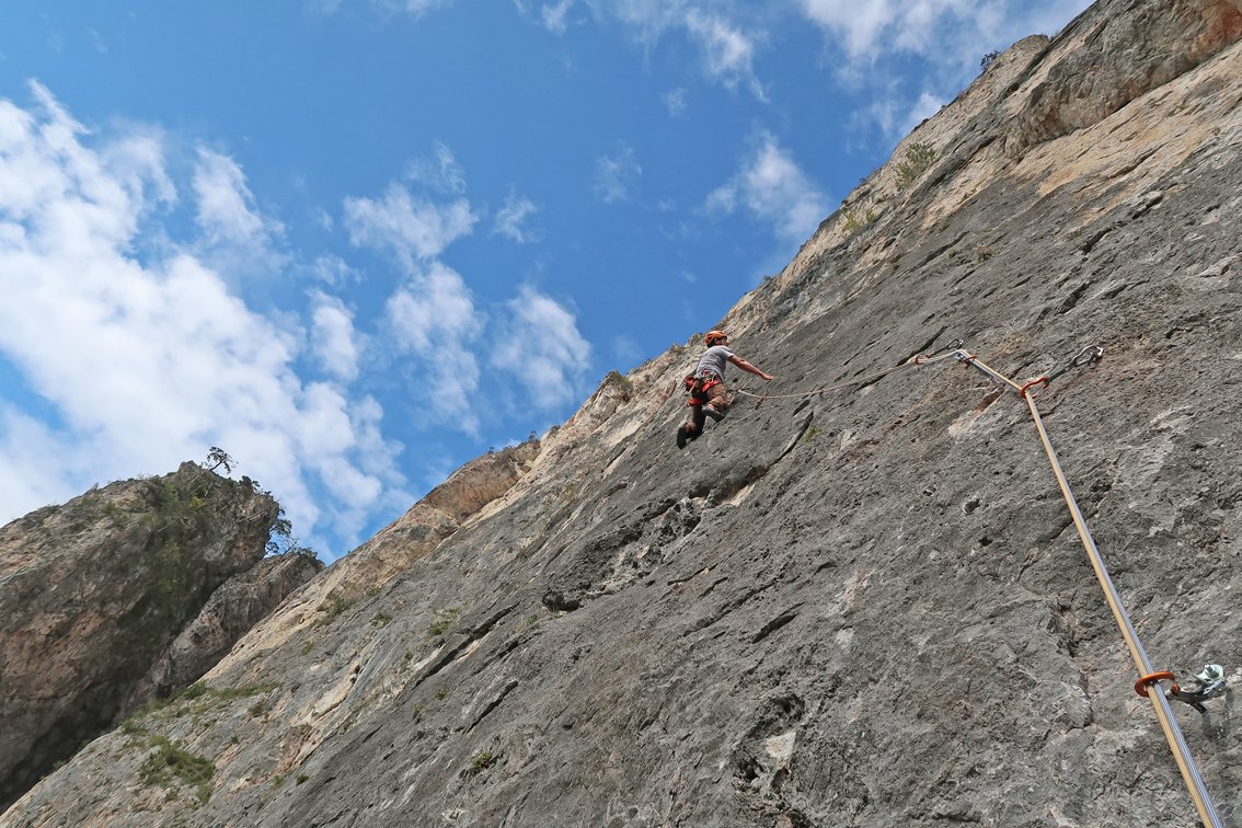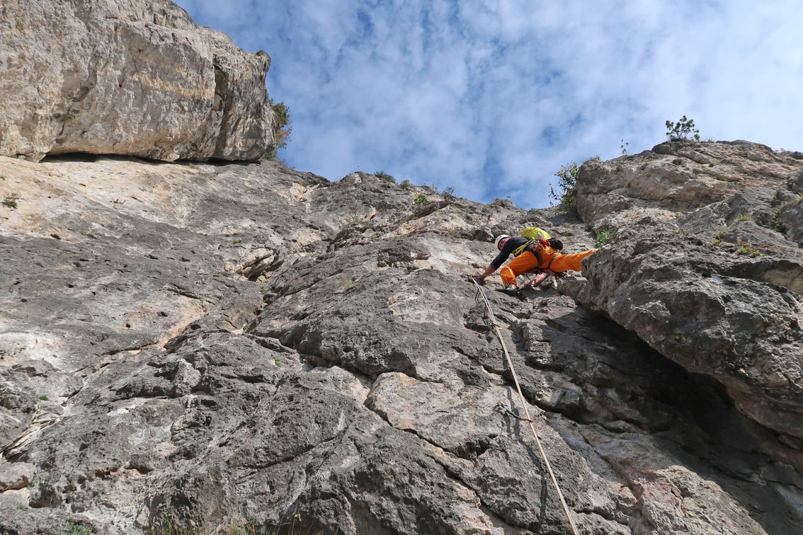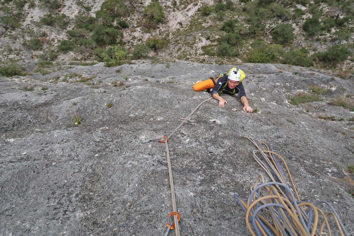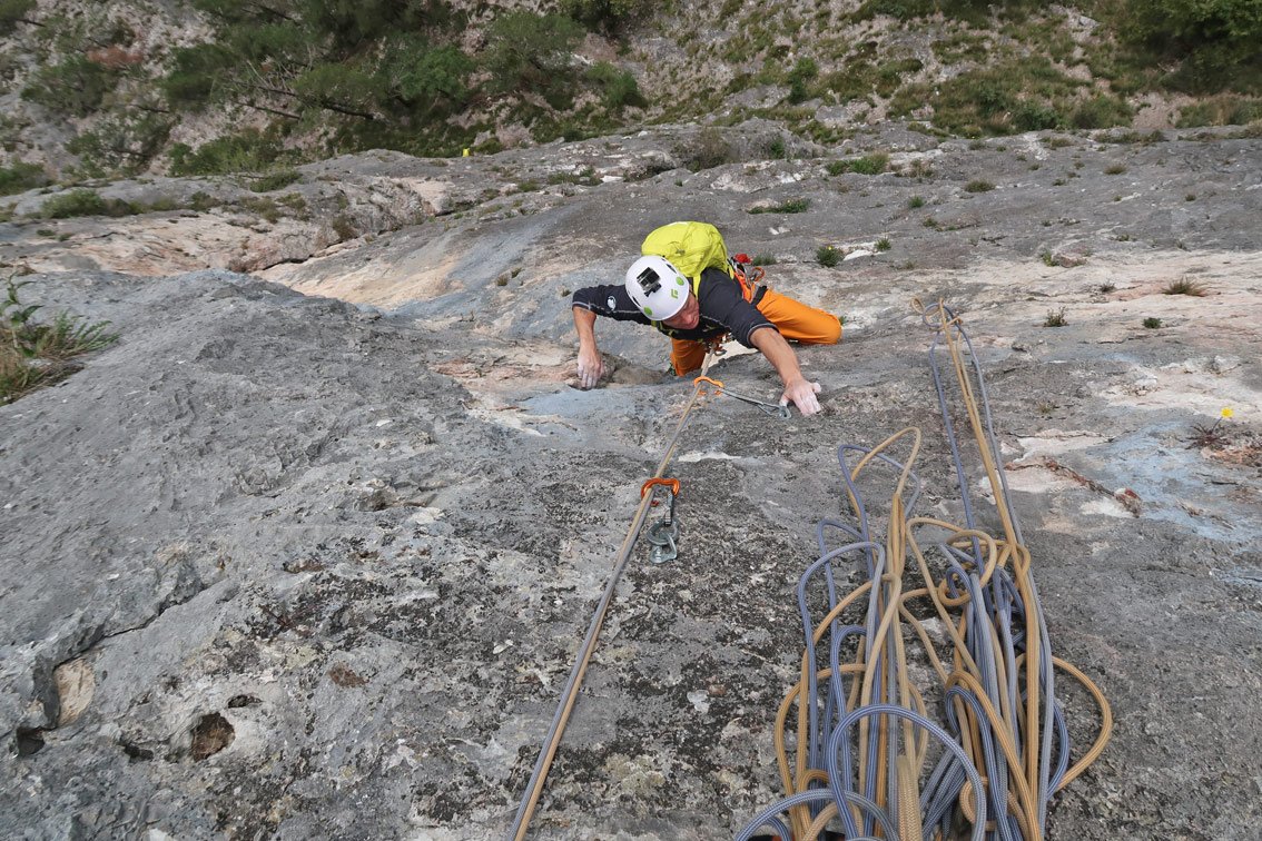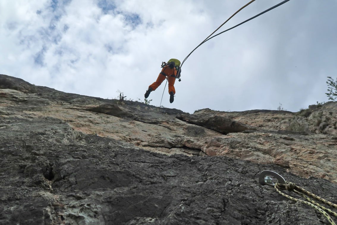 2 x 60 m Doppelseil (zum schnellen Abseilen des oberen Teils), 12 Expressschlingen und Helm.