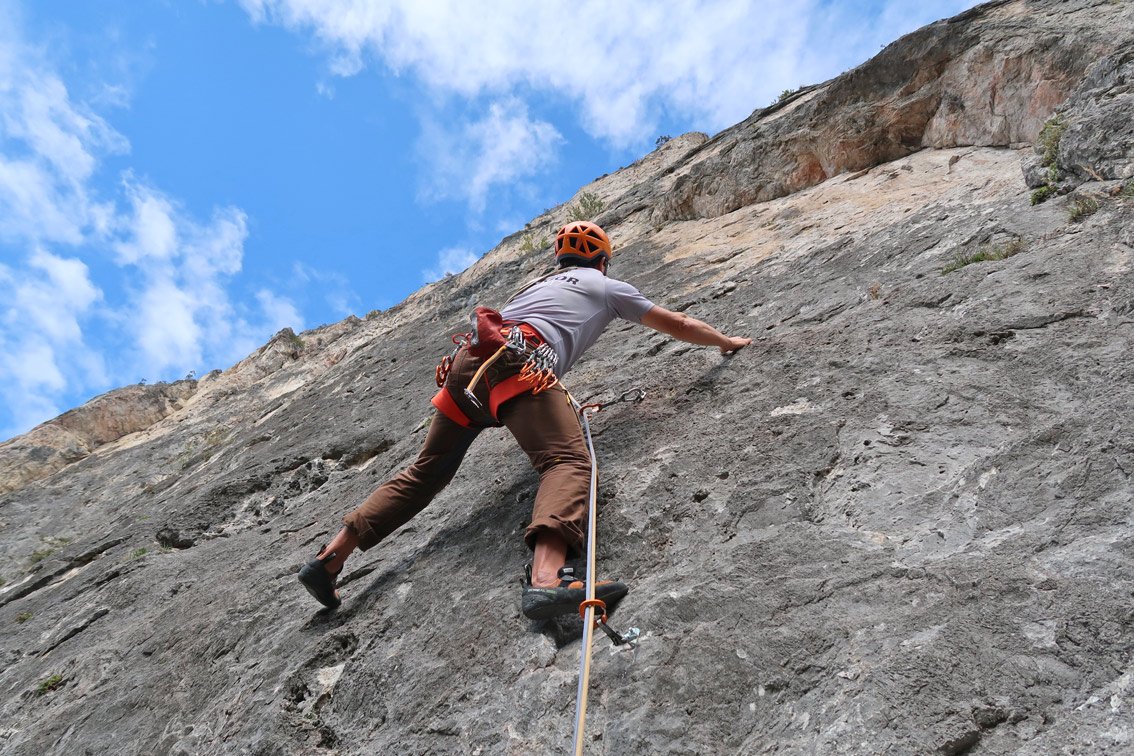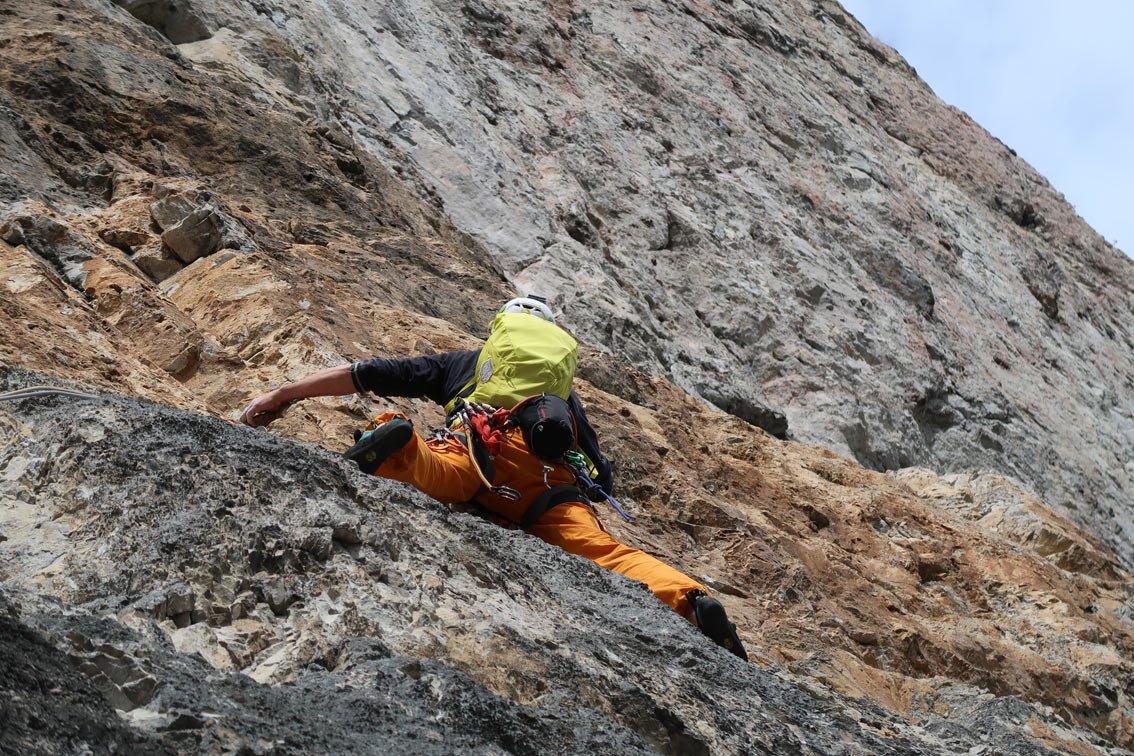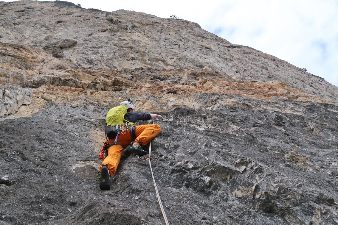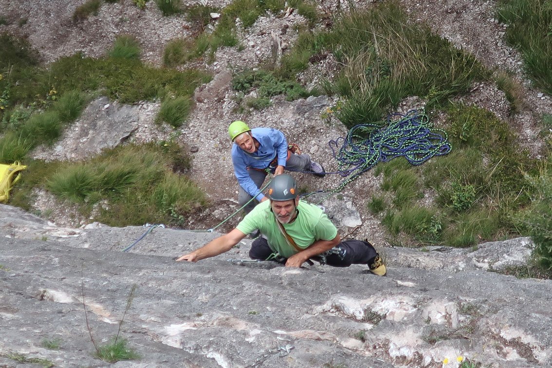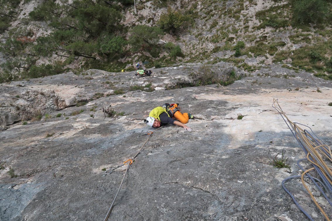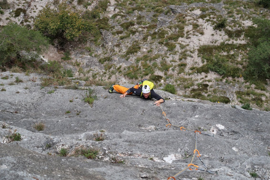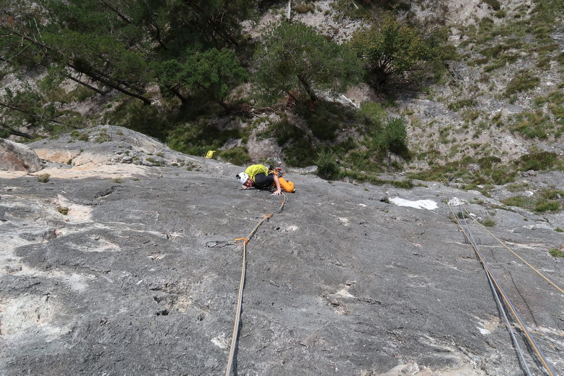 2 x 60 m Doppelseil (zum schnellen Abseilen des oberen Teils), 12 Expressschlingen und Helm.